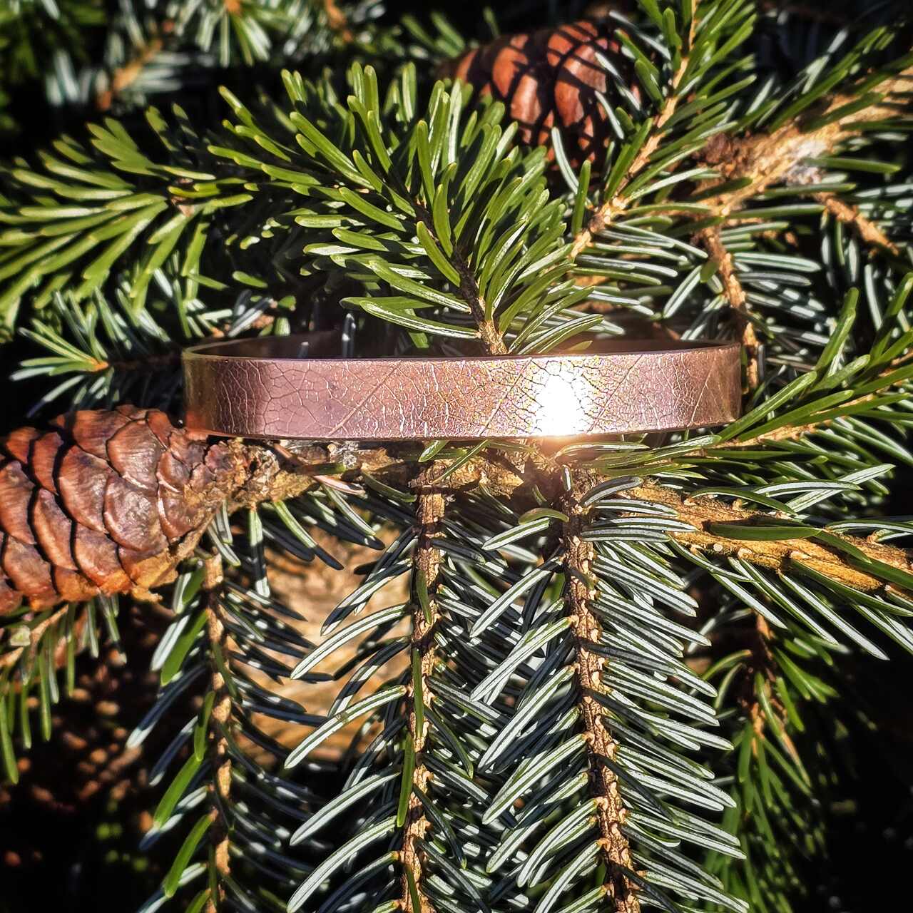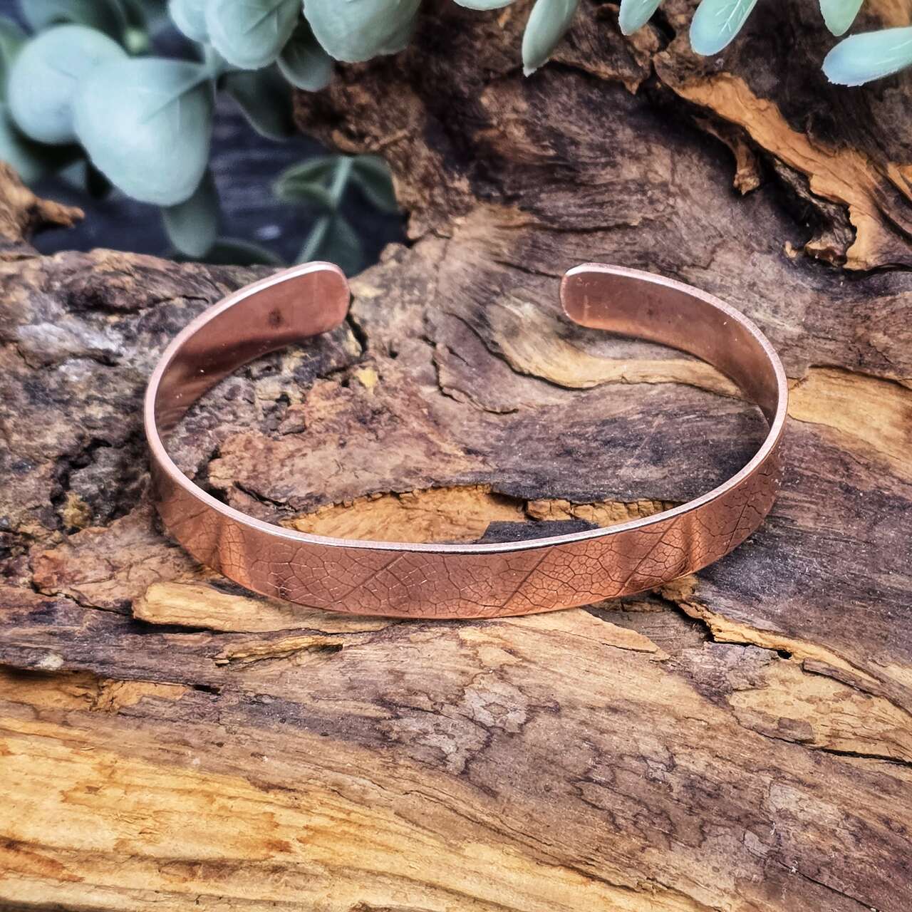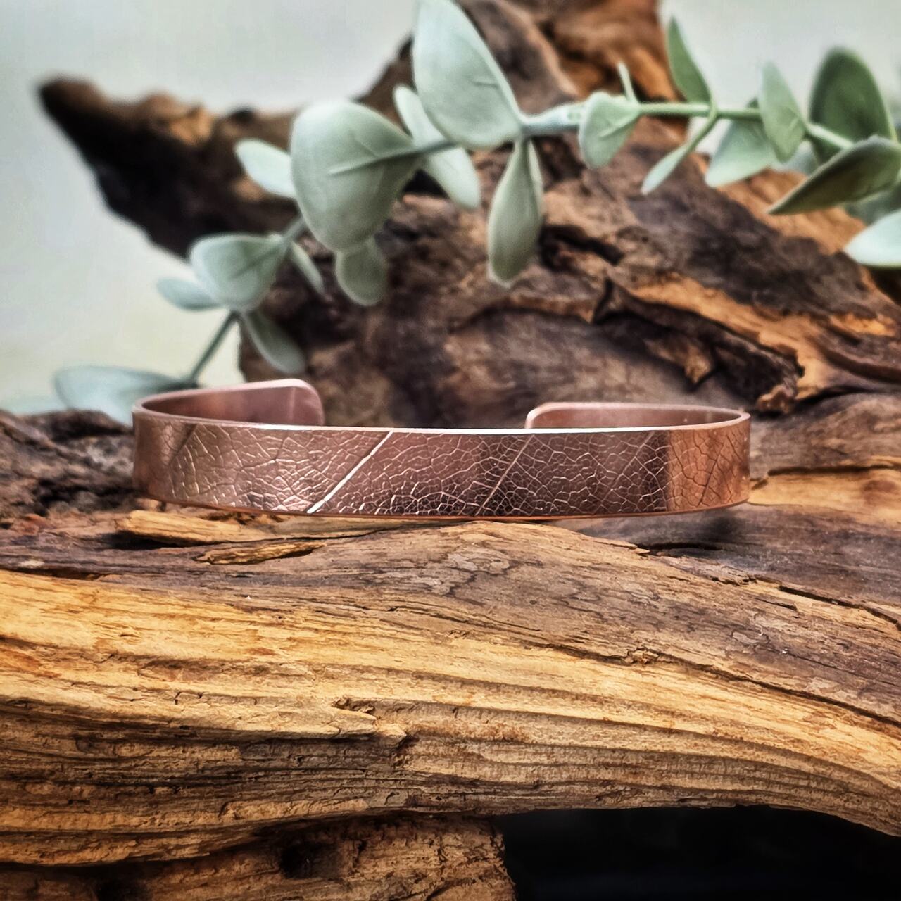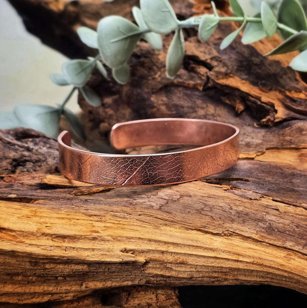 Bransoletka wykonana ręcznie z miedzi z odciskiem prawdziwych liści. Biżuteria miedziana noszona w bezpośrednim kontakcie ze skórą ma szereg właściwości zdrowotnych. Pomaga w likwidowaniu stanów zapalnych stawów, pomaga w leczeniu bólów stawów. Przynosi ulgę w dolegliwościach reumatycznych. Dodatkowo działa na przyśpieszenie metabolizmu glukozy i cholesterolu. Pomaga w regeneracji organizmu i zasypianiu. Miedź wchłania się przez skórę dlatego nie powinny jej nosić kobiet w ciąży oraz osoby z chorobami serca.