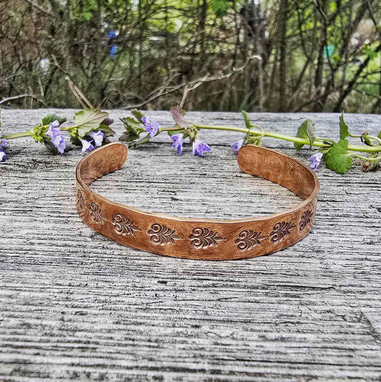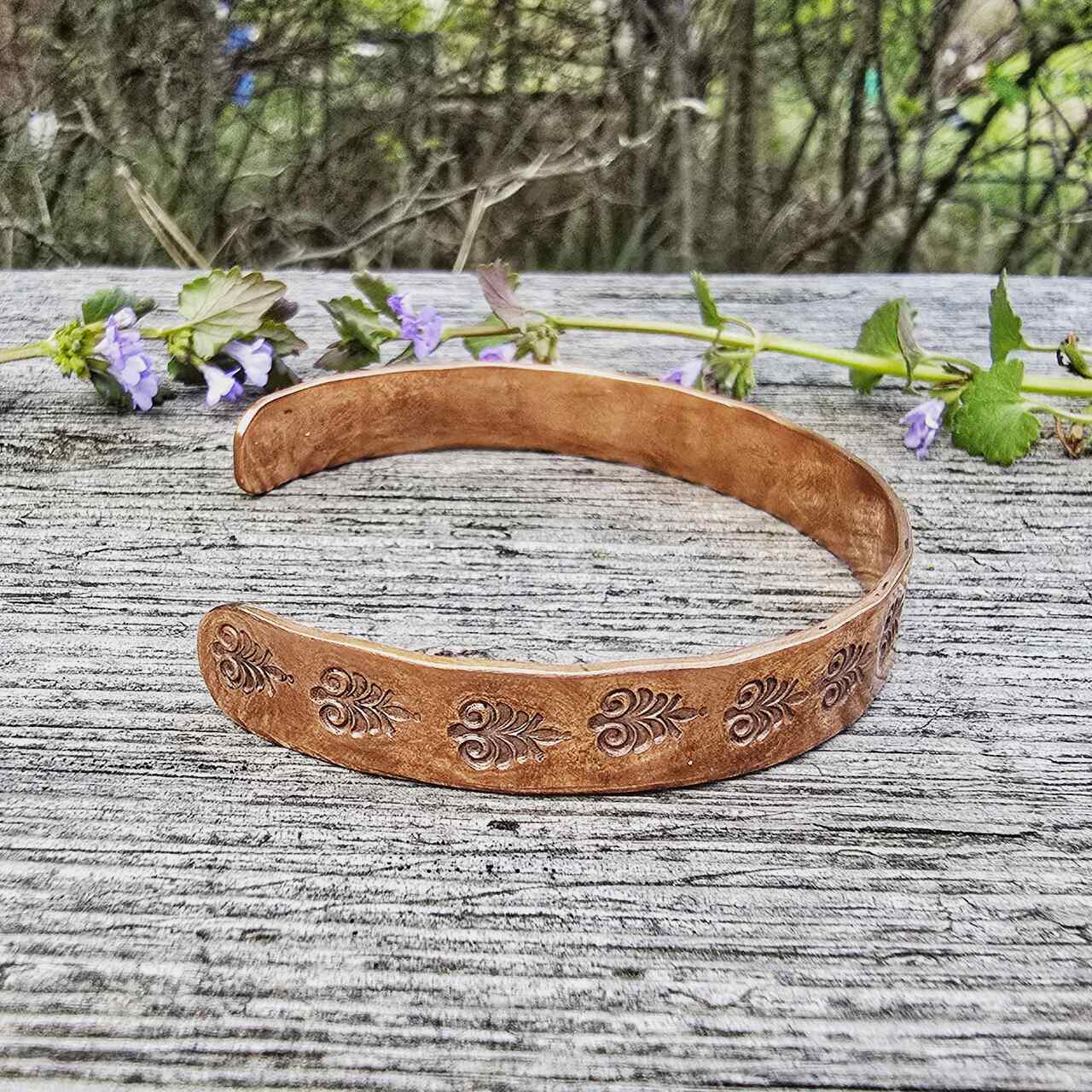 Bransoletka wykonana ręcznie z miedzi. Biżuteria miedziana noszona w bezpośrednim kontakcie ze skórą ma szereg właściwości zdrowotnych. Pomaga w likwidowaniu stanów zapalnych stawów, pomaga w leczeniu bólów stawów. Przynosi ulgę w dolegliwościach reumatycznych. Dodatkowo działa na przyśpieszenie metabolizmu glukozy i cholesterolu. Pomaga w regeneracji organizmu i zasypianiu. Miedź wchłania się przez skórę dlatego nie powinny jej nosić kobiet w ciąży oraz osoby z chorobami serca.