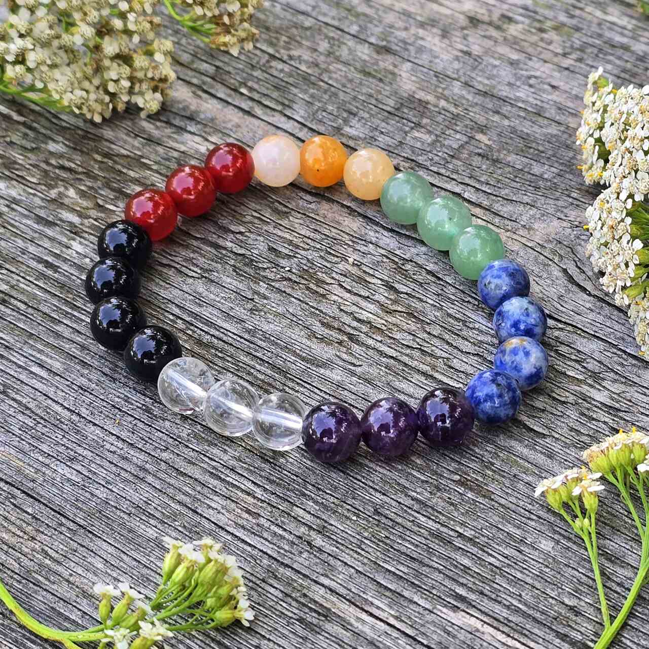 W bransoletce wykorzystano takie kamienie, jak ametyst, kwarc skalny, sodalit, zielony awenturyn, czarny agat, kalcyt miodowy i karneol. Każdy kamień odpowiada innej czakrze, przynosząc unikalny zestaw energii i korzyści.