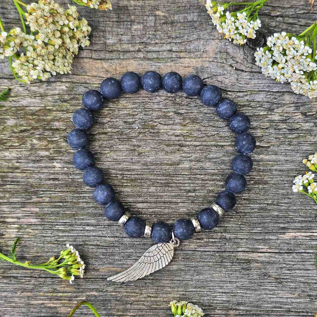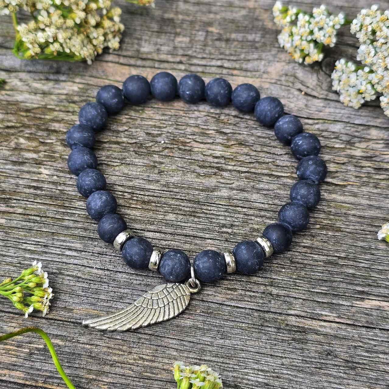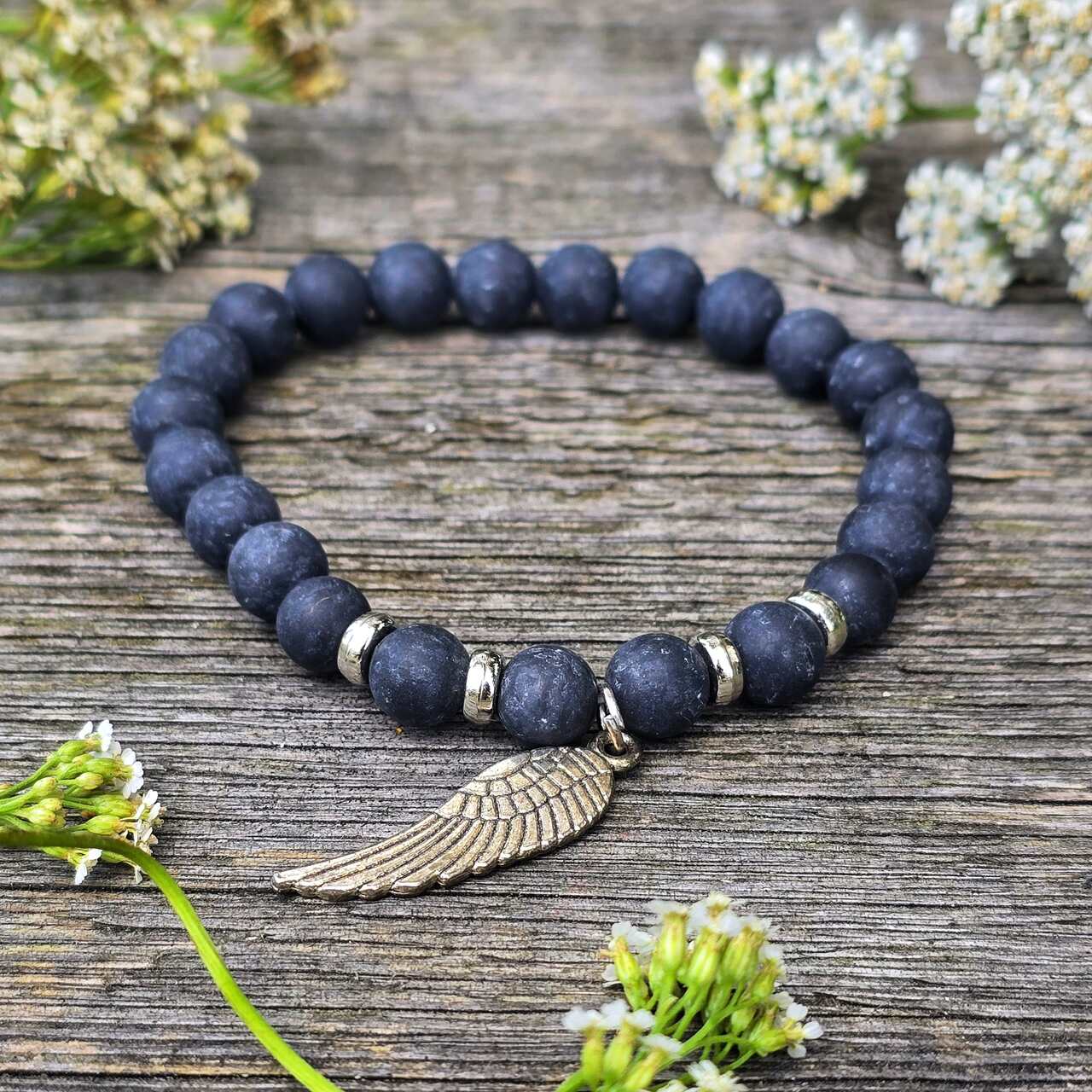 Bransoletka na mocnej gumce wykonana z kamieni agat z ozdobą w kształcie skrzydła. Pasuje na każdy rozmiar dłoni.  Kamień czarny agat to kamień ochronny, który dodaje odwagi, stabilizuje emocje, wzmacnia pewność siebie i chroni przed negatywnymi energiami.