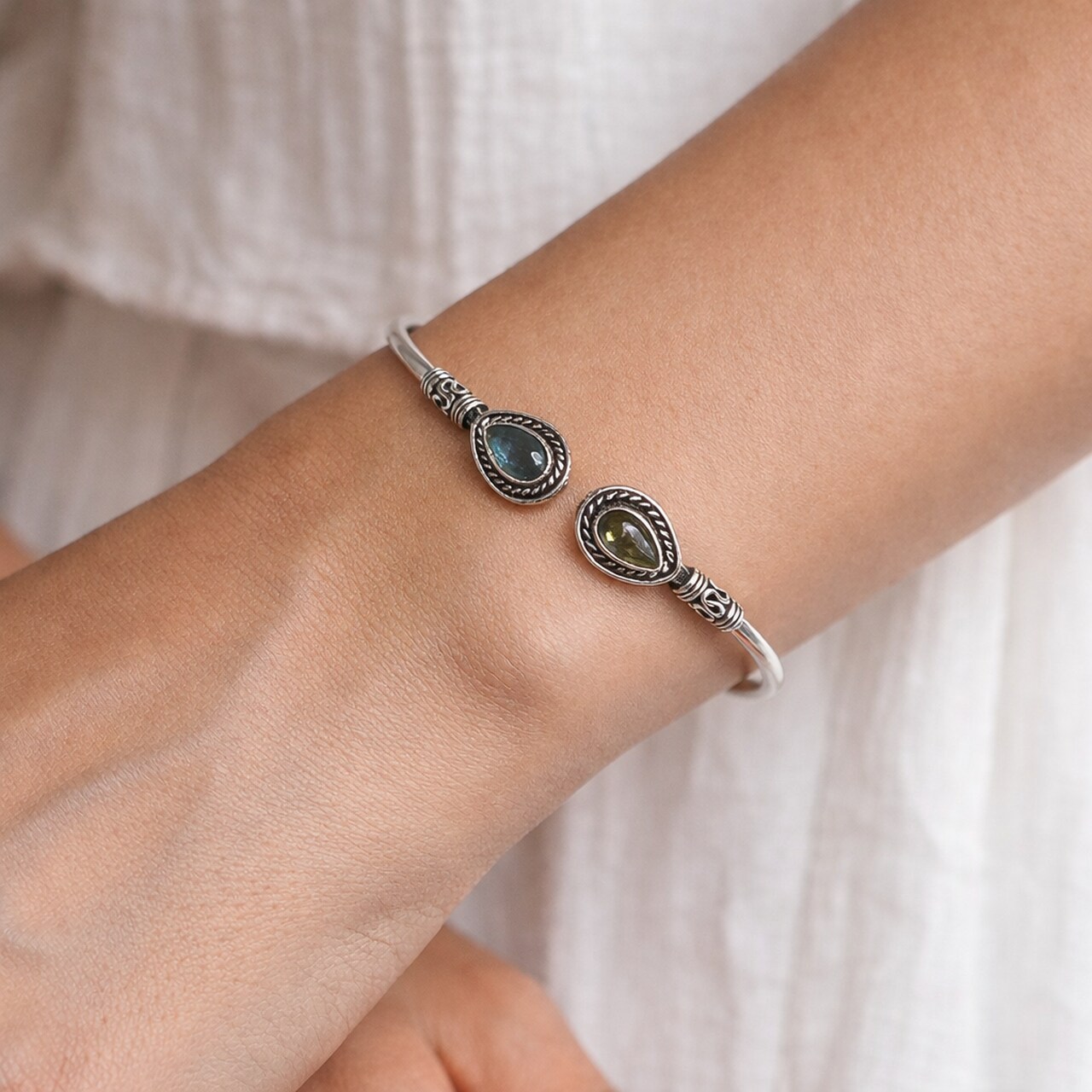 Bransoletka wykonana z mosiądzu z labradorytem. Łatwo wyregulujesz rozmiar.