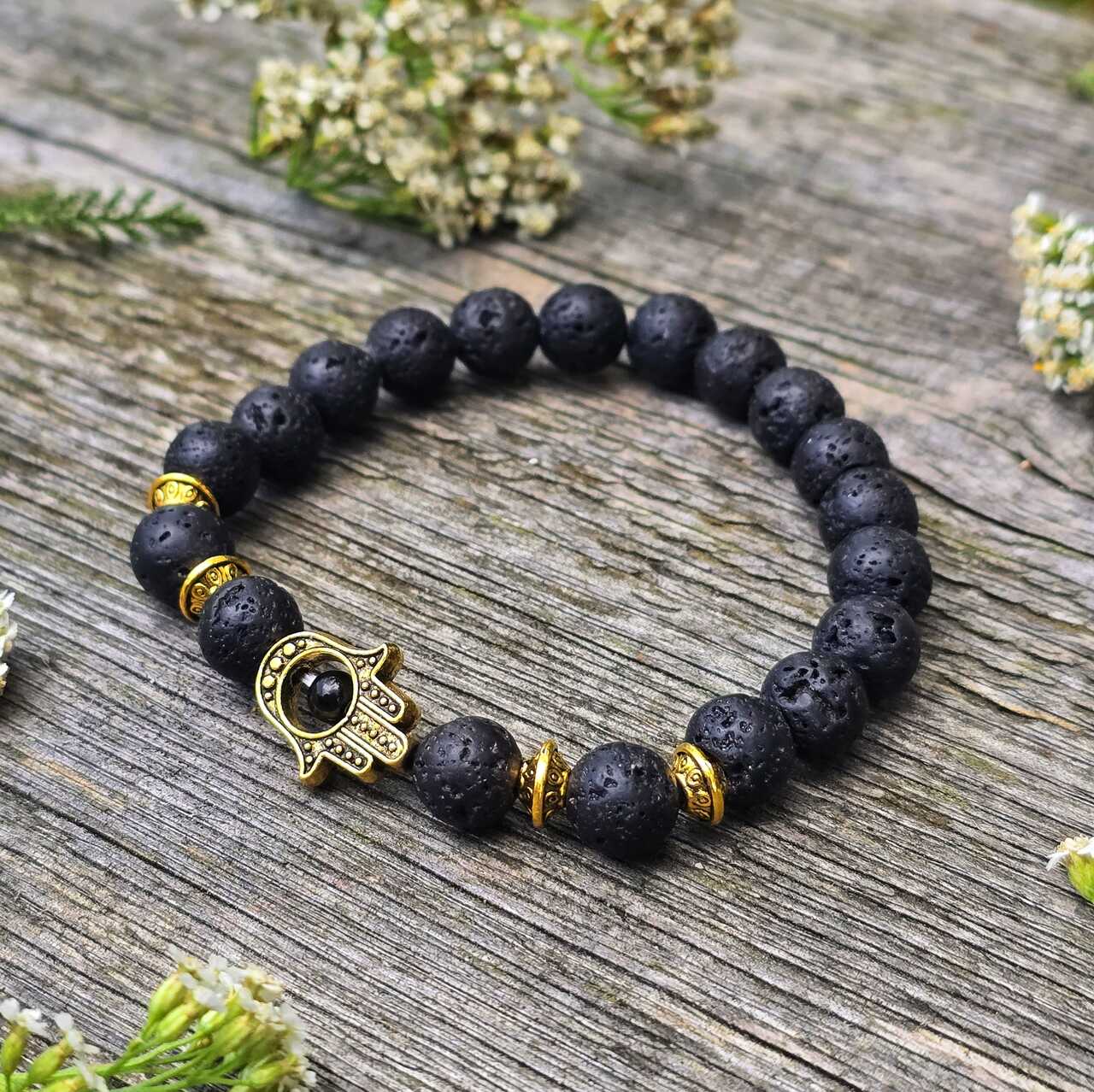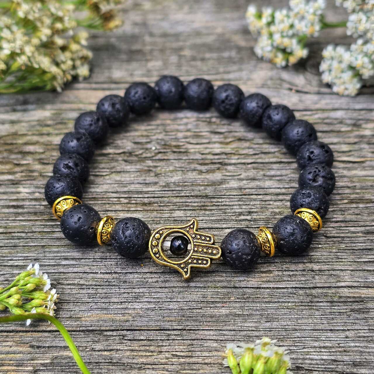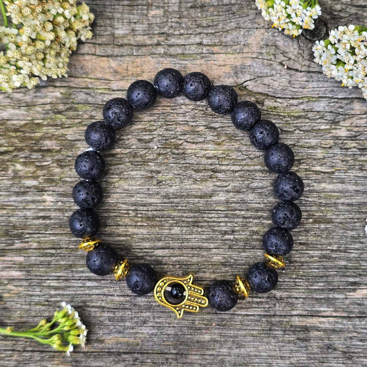Bransoletka na mocnej gumce wykonana z kamieni lawa z ozdobą w kształcie hamsy. Pasuje na każdy rozmiar dłoni.  Kamień lawa jest ceniony za swoje właściwości uziemienia i stabilizacji emocji, wzmocnienia siły wewnętrznej i motywacji do działania.