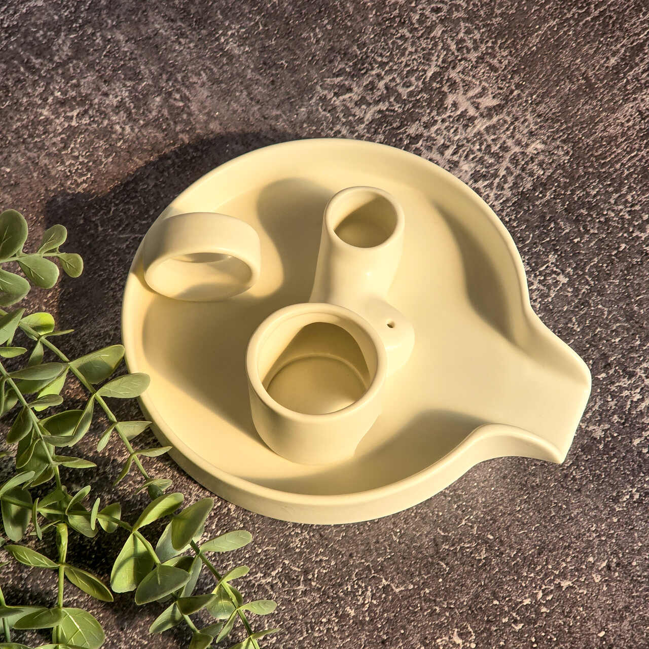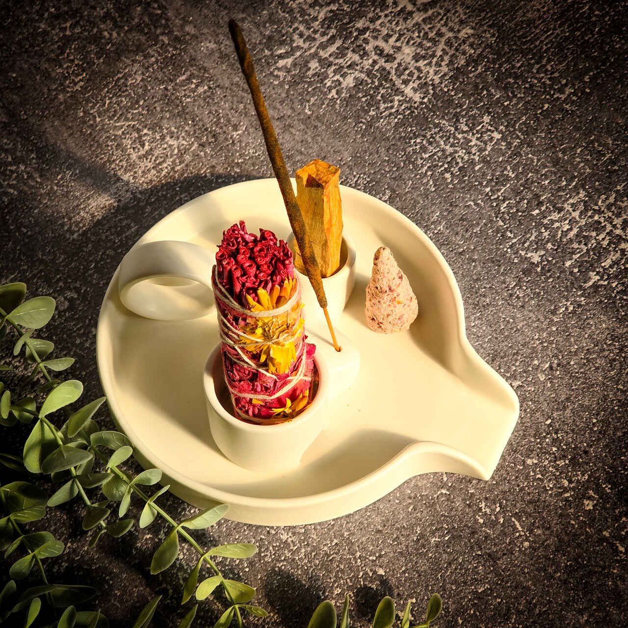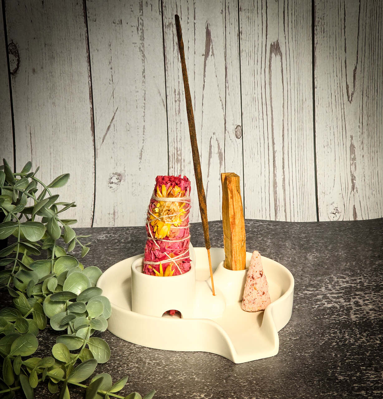 Ceramiczna, uniwersalna podstawka do wszystkich kadzideł. Posiada miejsce na wiązki typu biała szałwia, mniejsze miejsce na patyczki palo santo, otwór do kadzidełek patyczkowych, oraz nada się również do kadzidełek stożkowych. Jest duża i posiada wygodny uchwyt, który przyda się przy rytuałach okadzania.