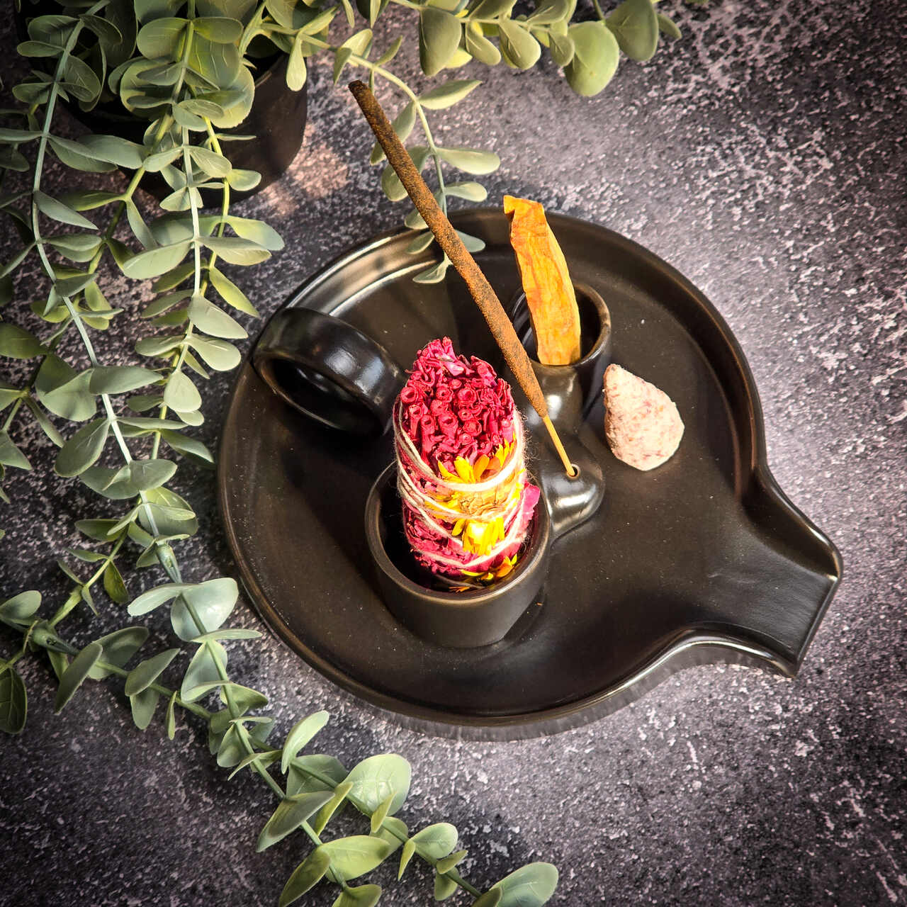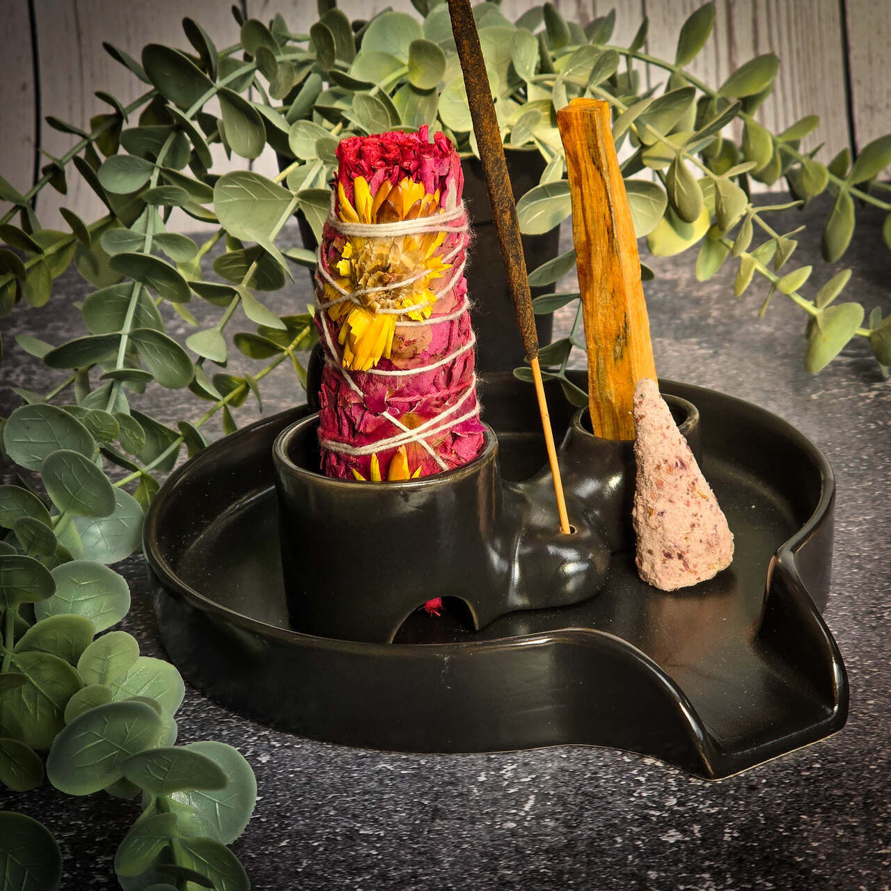Ceramiczna, uniwersalna podstawka do wszystkich kadzideł. Posiada miejsce na wiązki typu biała szałwia, mniejsze miejsce na patyczki palo santo, otwór do kadzidełek patyczkowych, oraz nada się również do kadzidełek stożkowych. Jest duża i posiada wygodny uchwyt, który przyda się przy rytuałach okadzania.