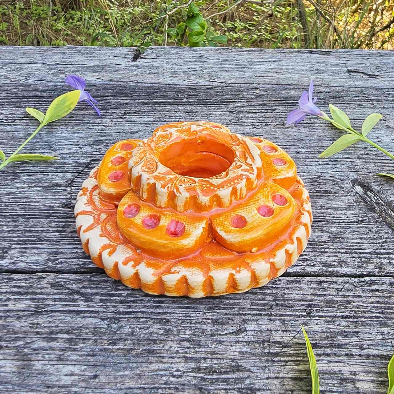 Przepiękny, kolorowy ceramiczny świecznik. Powstał ręcznie. Szkliwiony. Świecznik jest masywny i ciężki, bez problemu utrzyma świeczkę.