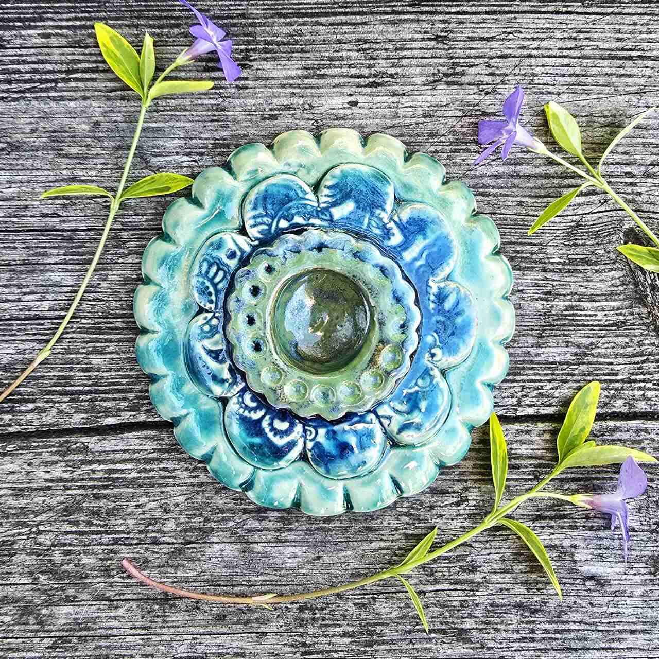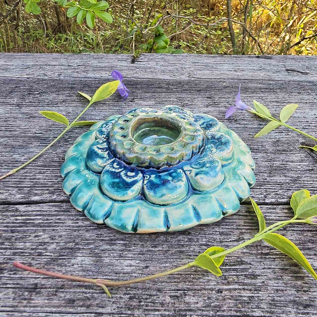 Przepiękny, kolorowy ceramiczny świecznik. Powstał ręcznie. Szkliwiony. Świecznik jest masywny i ciężki, bez problemu utrzyma świeczkę.