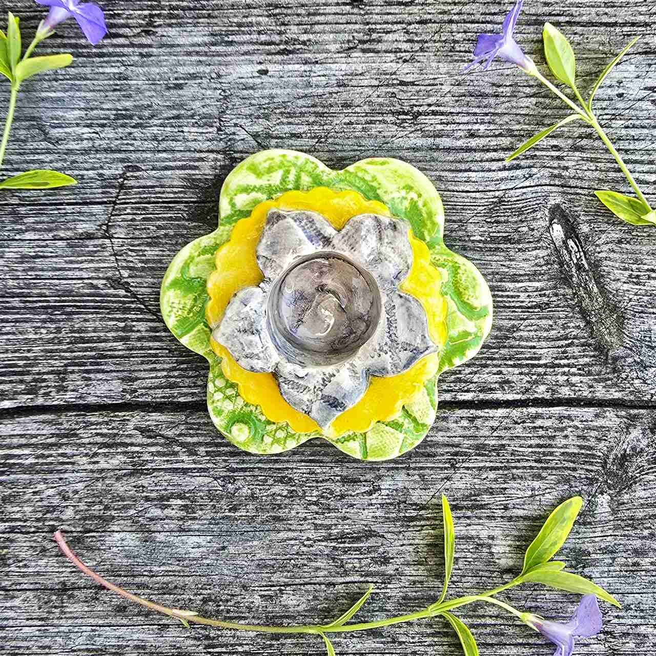 Przepiękny, kolorowy ceramiczny świecznik. Powstał ręcznie. Szkliwiony. Świecznik jest masywny i ciężki, bez problemu utrzyma świeczkę.