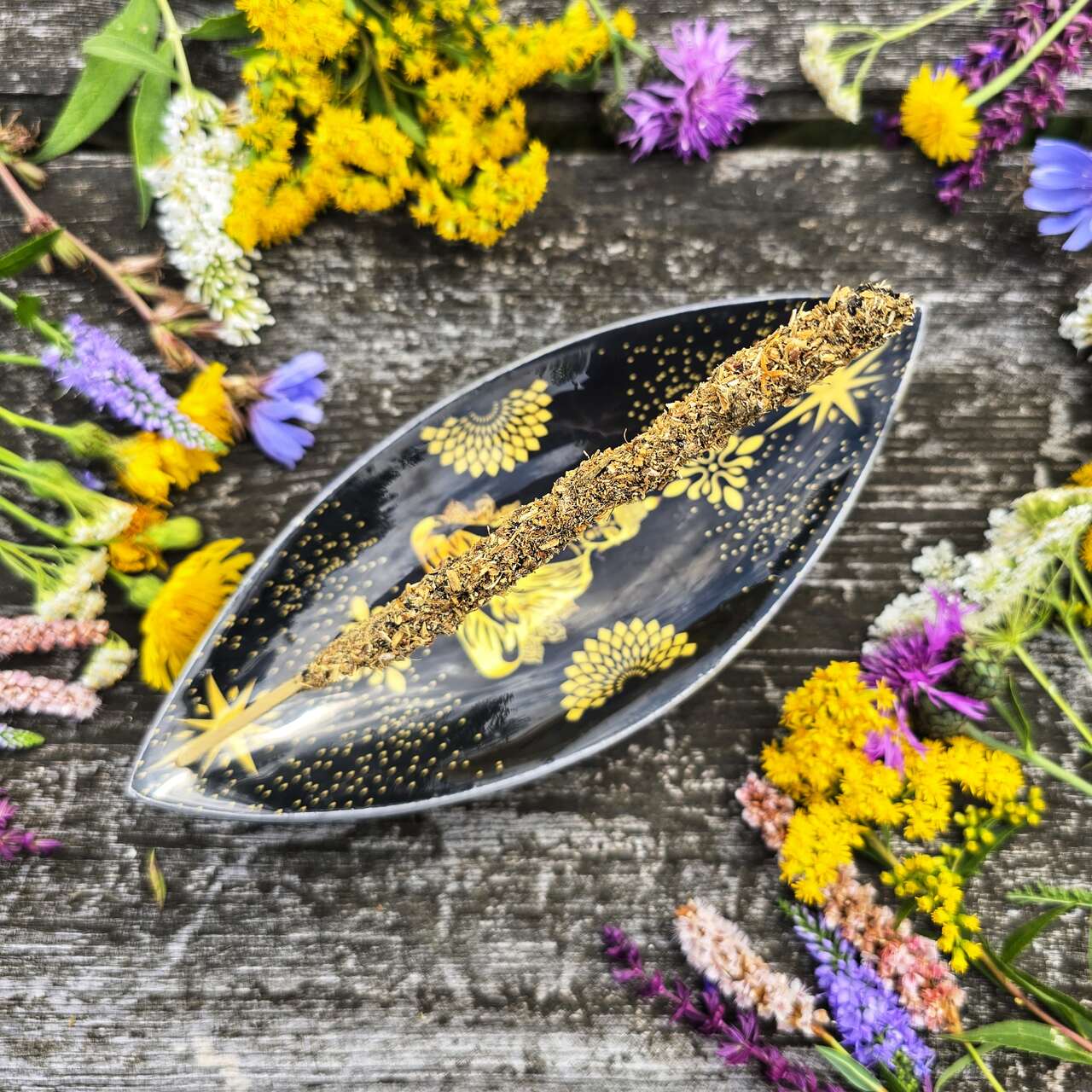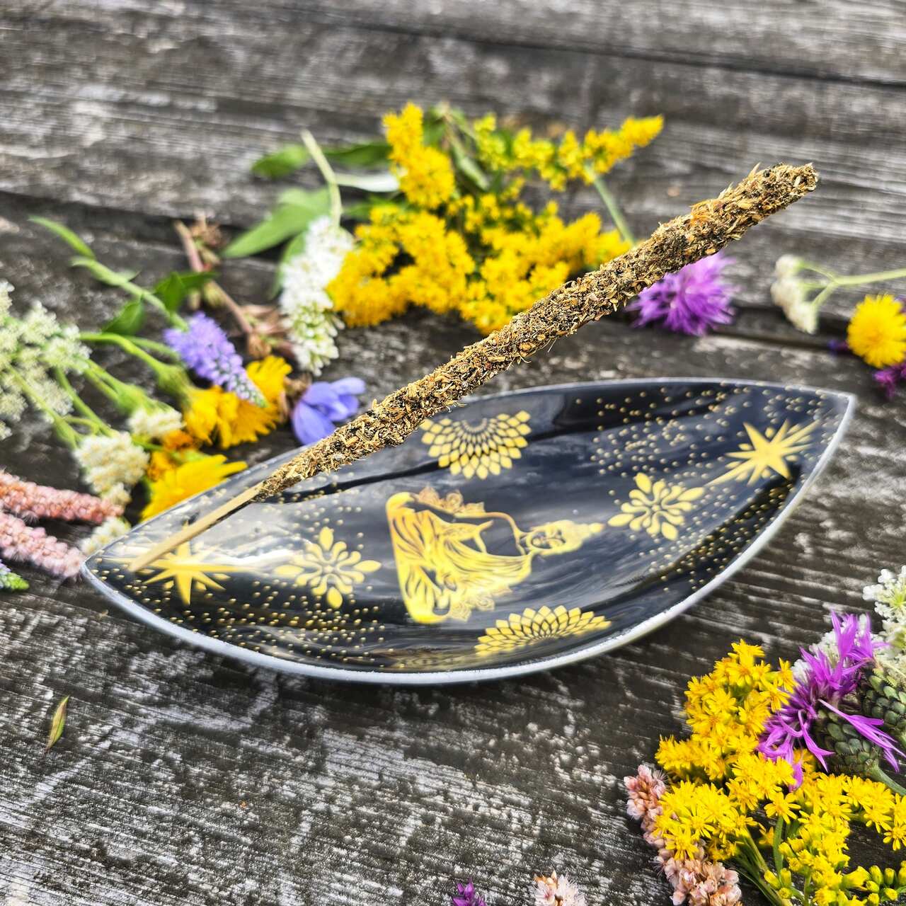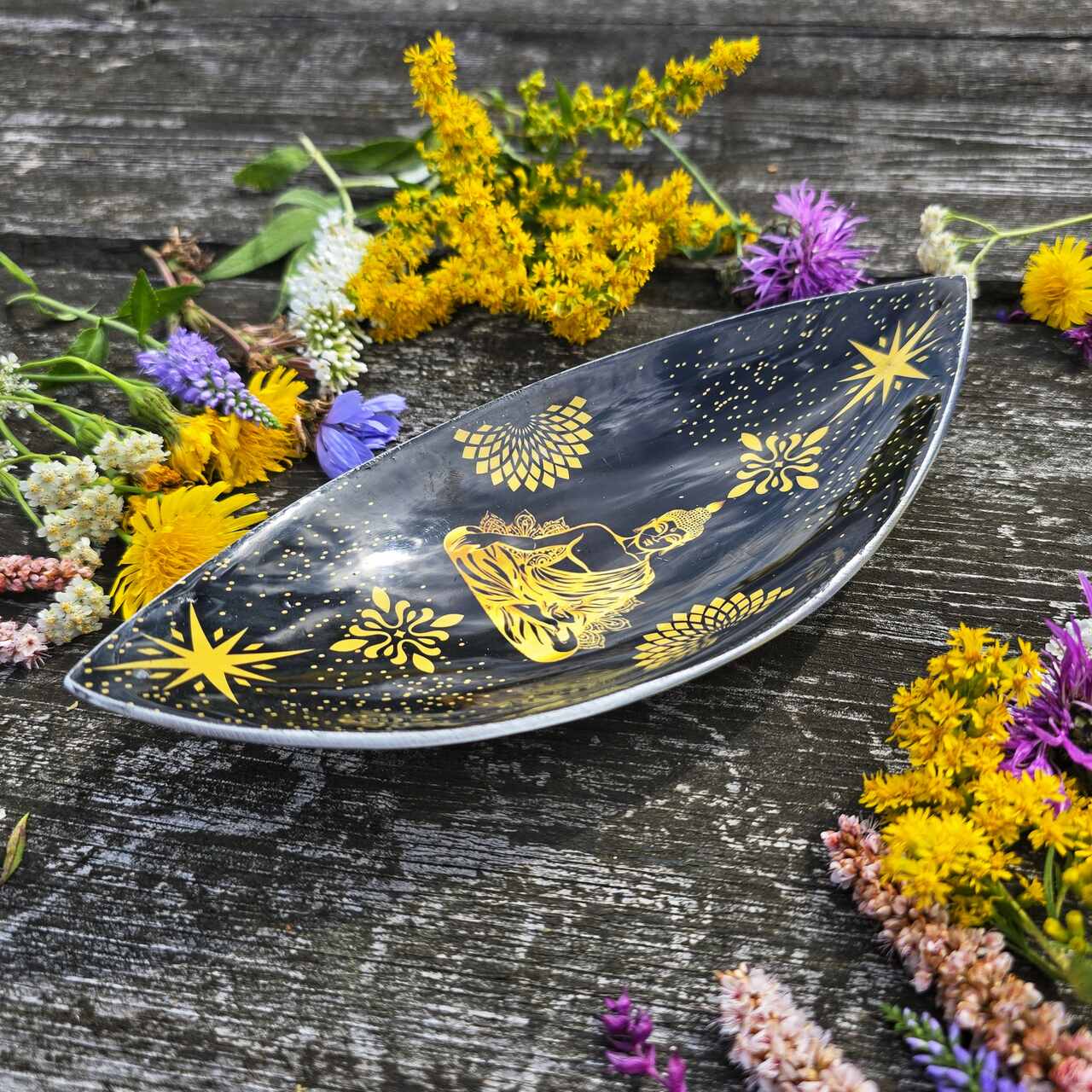 Przepiękna podstawka wykonana z aluminium. Górna część pokryta kolorową emalią. Mocno przyciągająca wzrok i pełna symboliki. Nadaje się pod kadzidełka patyczkowe – posiada otworu z obu końców, pod stożki, jak i ze względu na swoją szerokość również do kadzideł w wiązkach. Wspaniała ozdoba wnętrza.