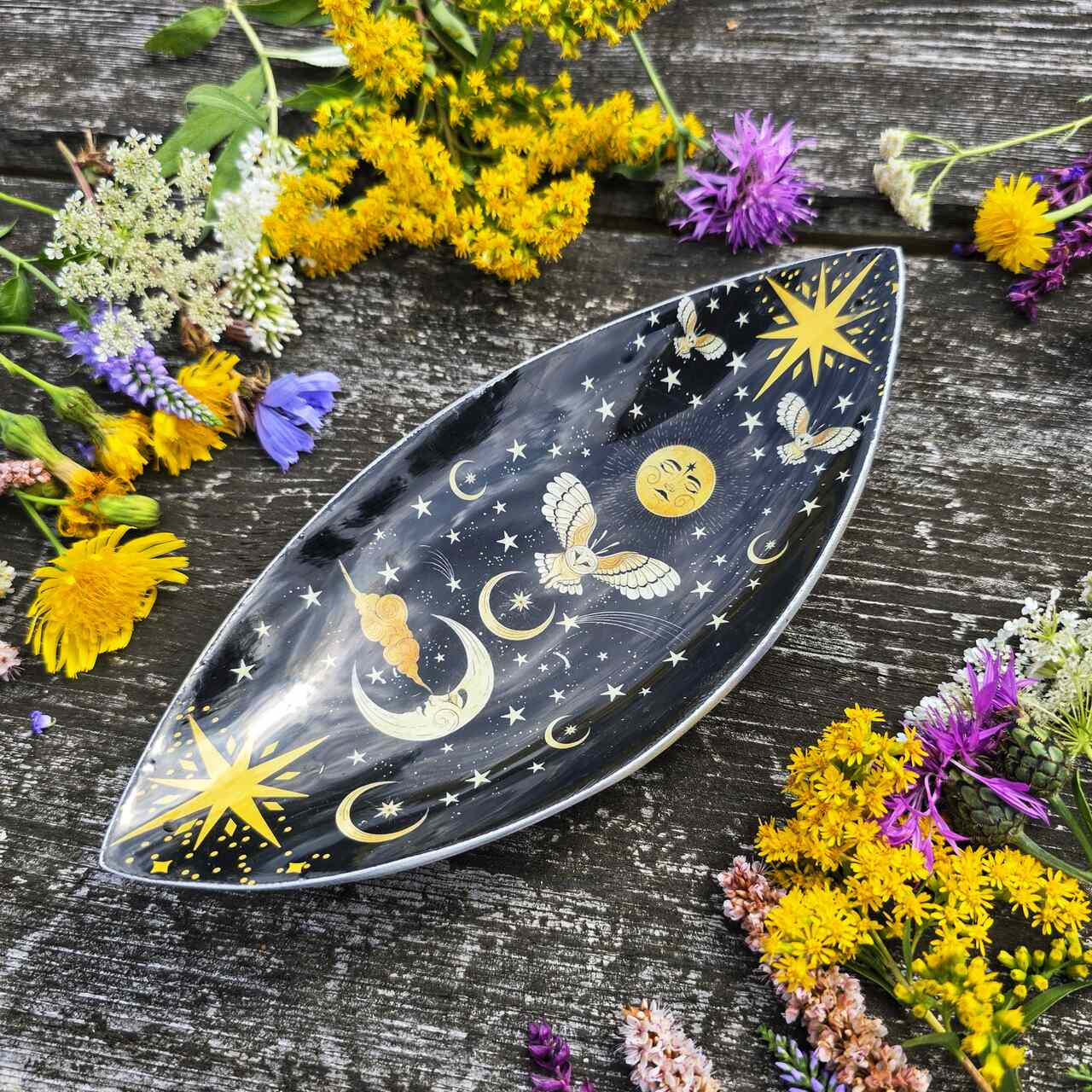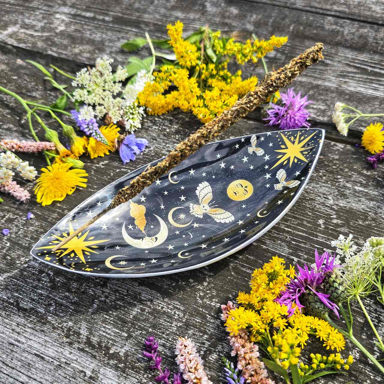 Przepiękna podstawka wykonana z aluminium. Górna część pokryta kolorową emalią. Mocno przyciągająca wzrok i pełna symboliki. Nadaje się pod kadzidełka patyczkowe – posiada otworu z obu końców, pod stożki, jak i ze względu na swoją szerokość również do kadzideł w wiązkach. Wspaniała ozdoba wnętrza.