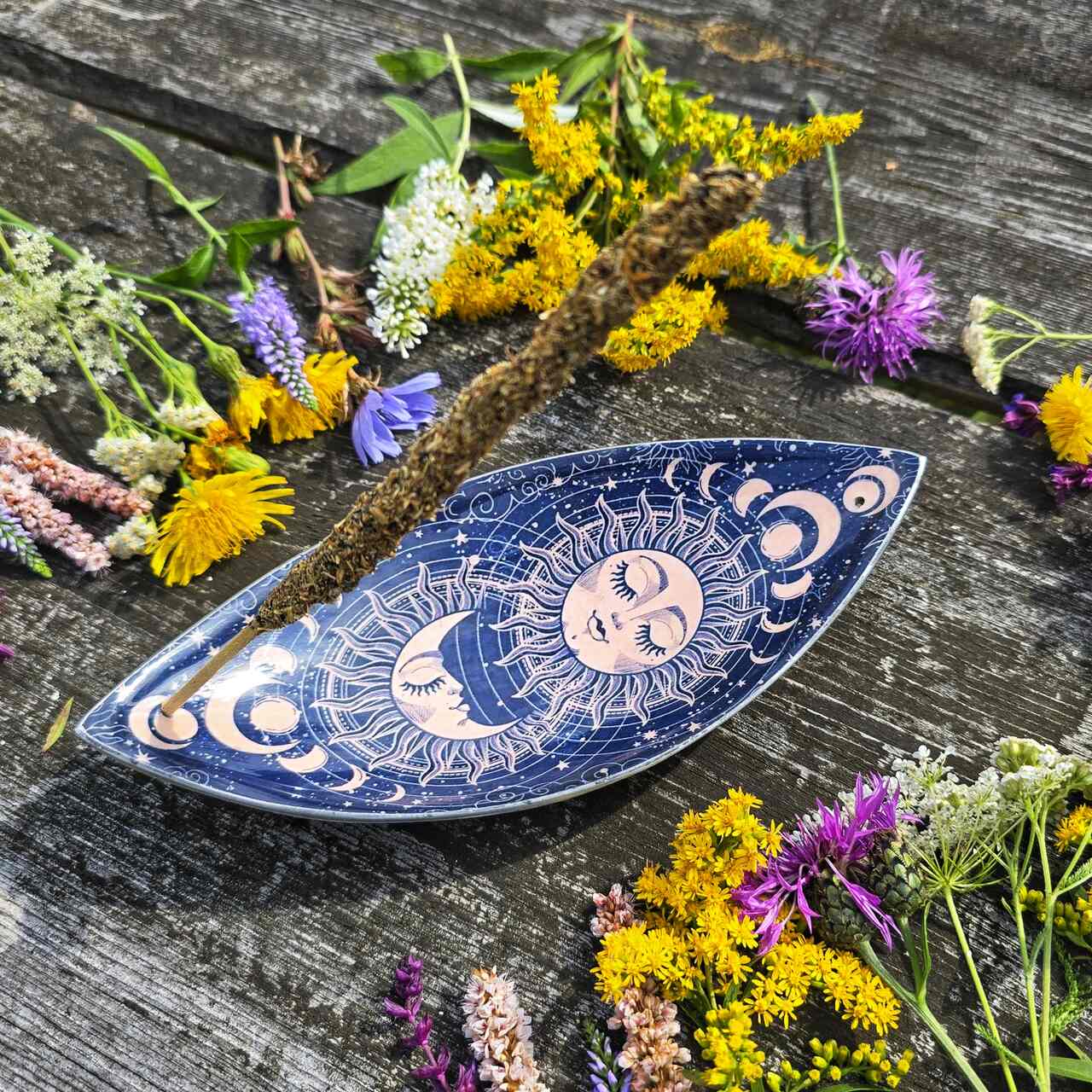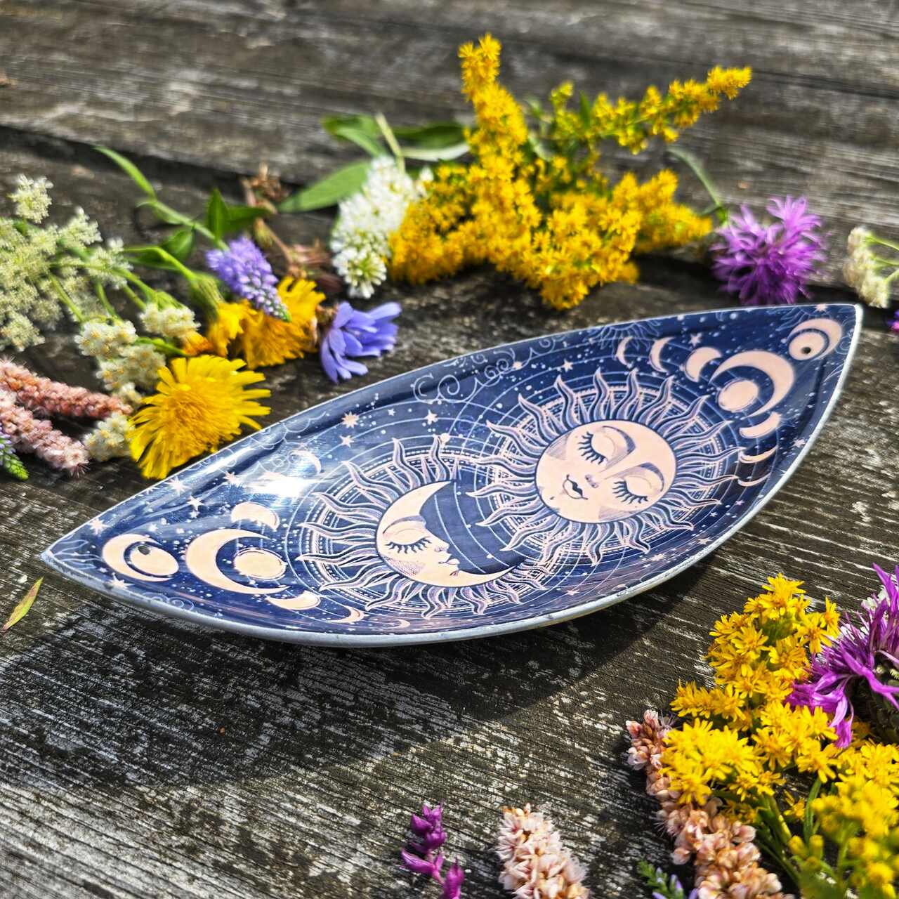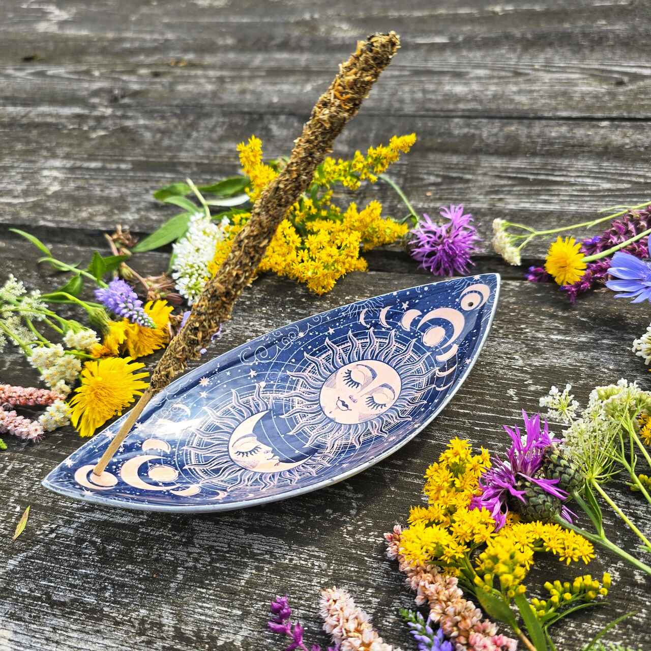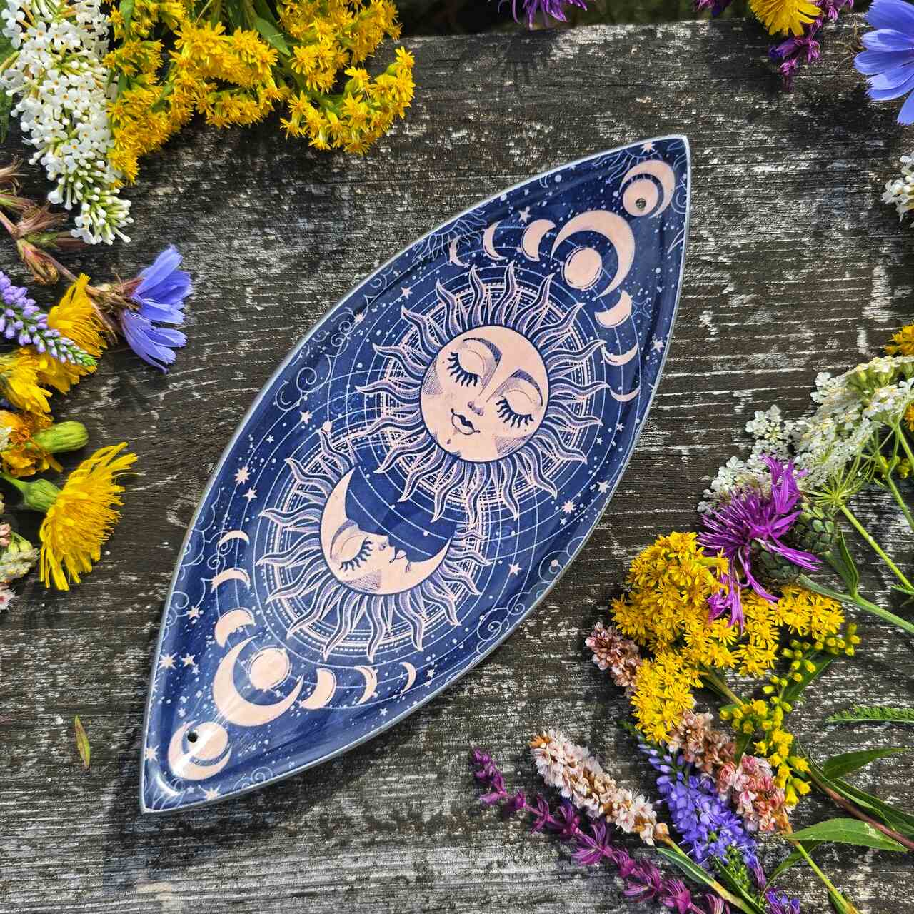 Przepiękna podstawka wykonana z aluminium. Górna część pokryta kolorową emalią. Mocno przyciągająca wzrok i pełna symboliki. Nadaje się pod kadzidełka patyczkowe – posiada otworu z obu końców, pod stożki, jak i ze względu na swoją szerokość również do kadzideł w wiązkach. Wspaniała ozdoba wnętrza.