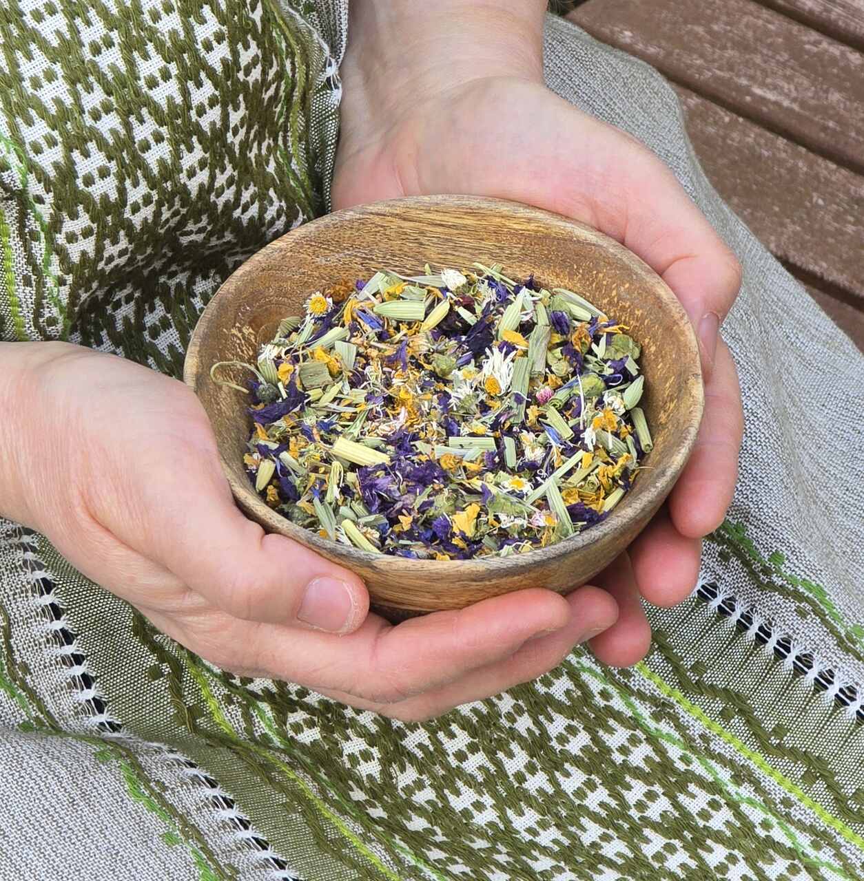 Skład: stokrotki, owies, kwiat forsycji, kwiat mniszka, kwiat dzikiego ślazu, hibiskus, płatki chabra