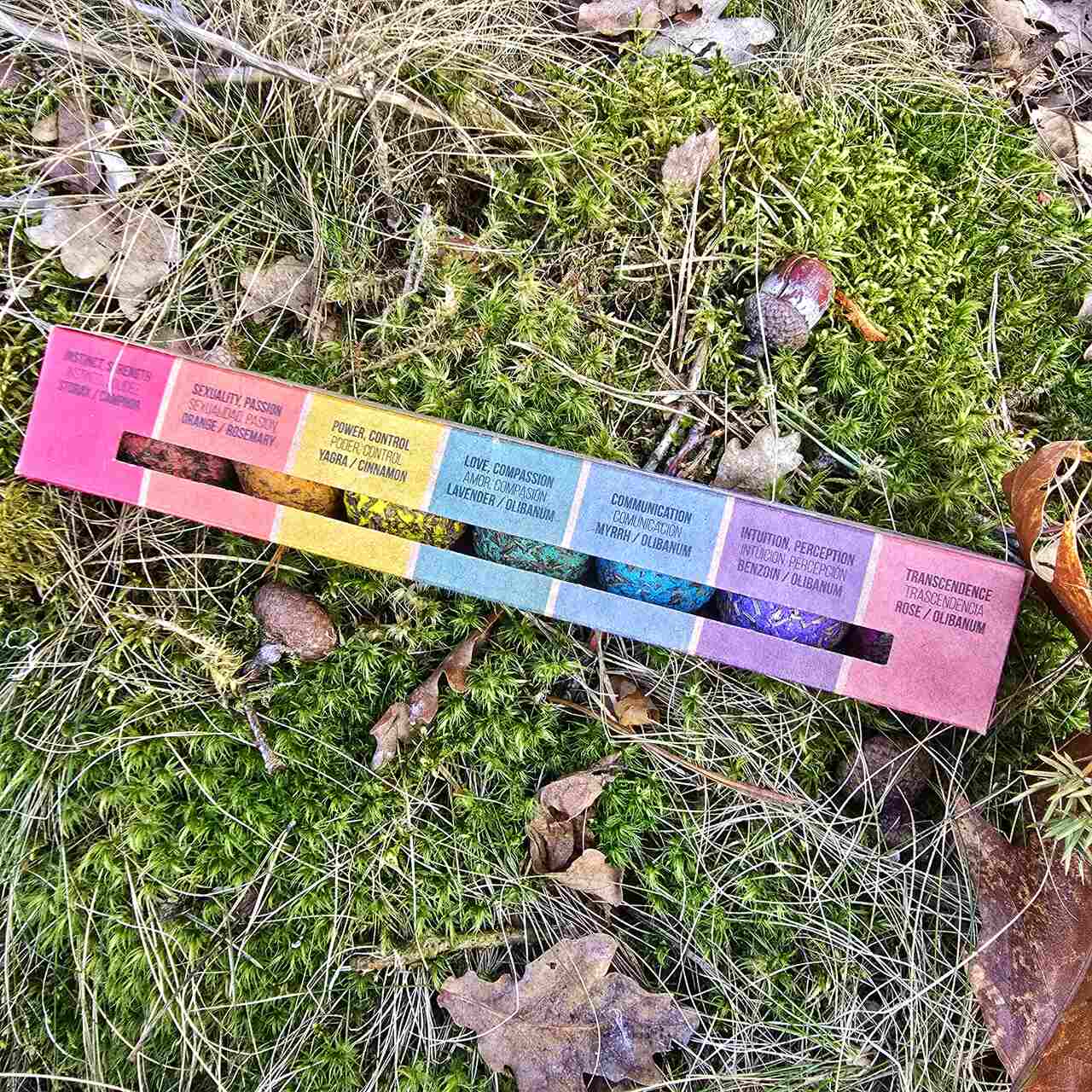 Kadzidła w kształcie kul. Kule tzw. bomby dymiące, dają niezwykle spektakularny efekt podczas palenia. Każda kula w opakowaniu ma inny zapach i kolor: storax – kamfora, pomarańcza- cynamon, lawenda-olibanum, mirra-olibanum, benzoin-olibanum, róża-olibanum.