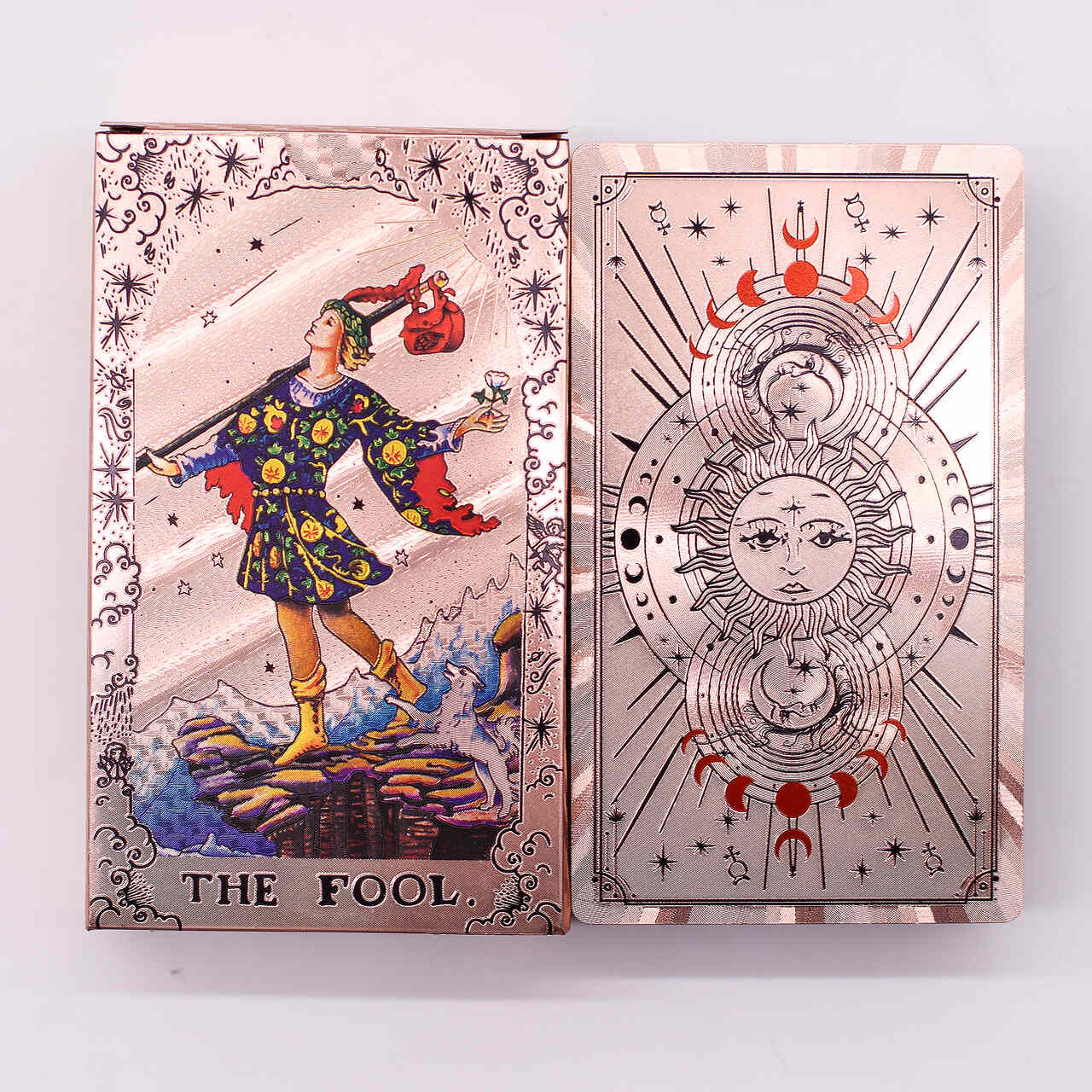 Luksusowy zestaw kart tarota z motywem Fazy Księżyca, wykończony folią w kolorze różowego złota, która nadaje talii wyjątkowy blask. Każda z 78 kart łączy klasyczną symbolikę tarota z eleganckim, księżycowym motywem, tworząc wizualnie zachwycający i spójny zestaw, który przyciąga uwagę klientów.