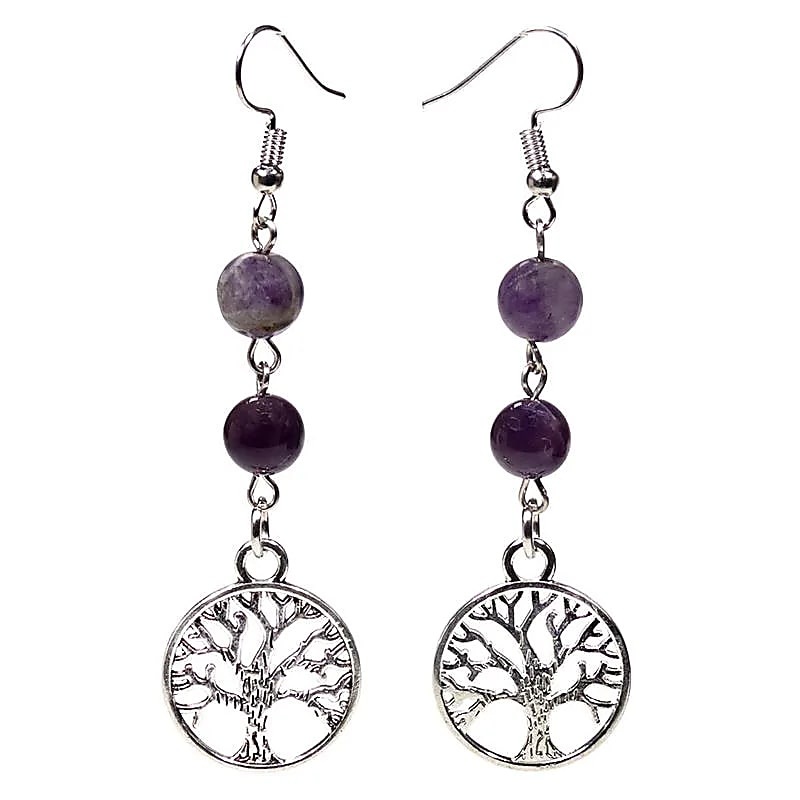 Eleganckie kolczyki z fluorytu i ametystu, ozdobione drzewem życia.
