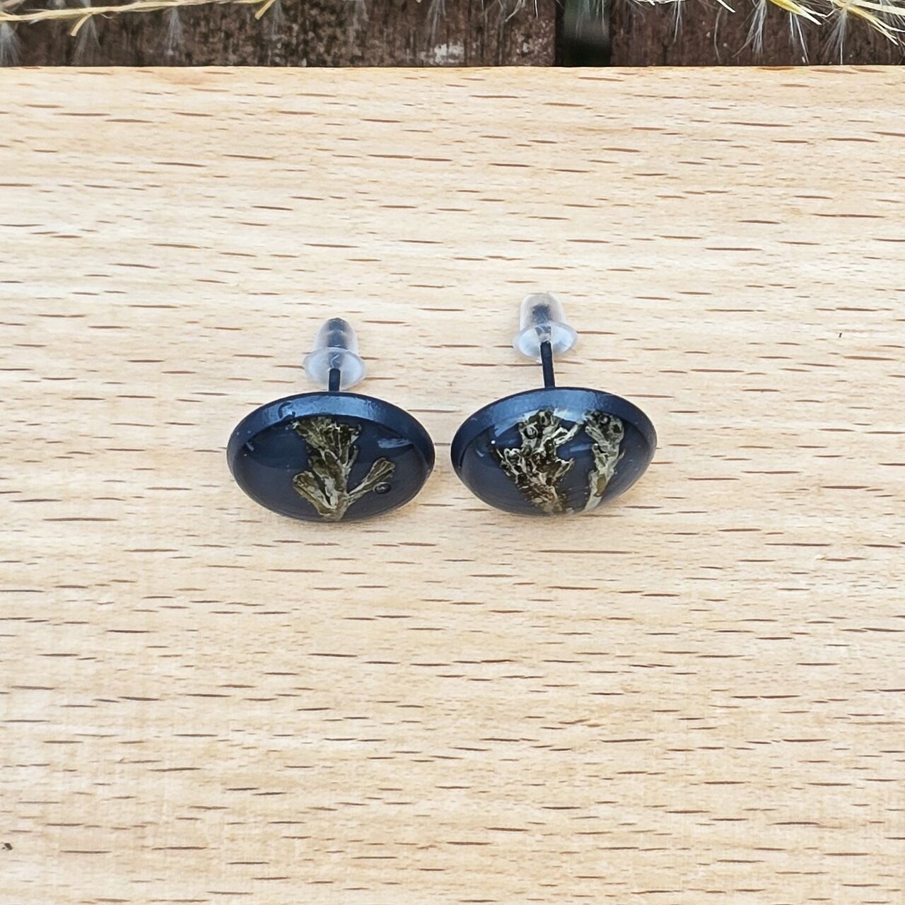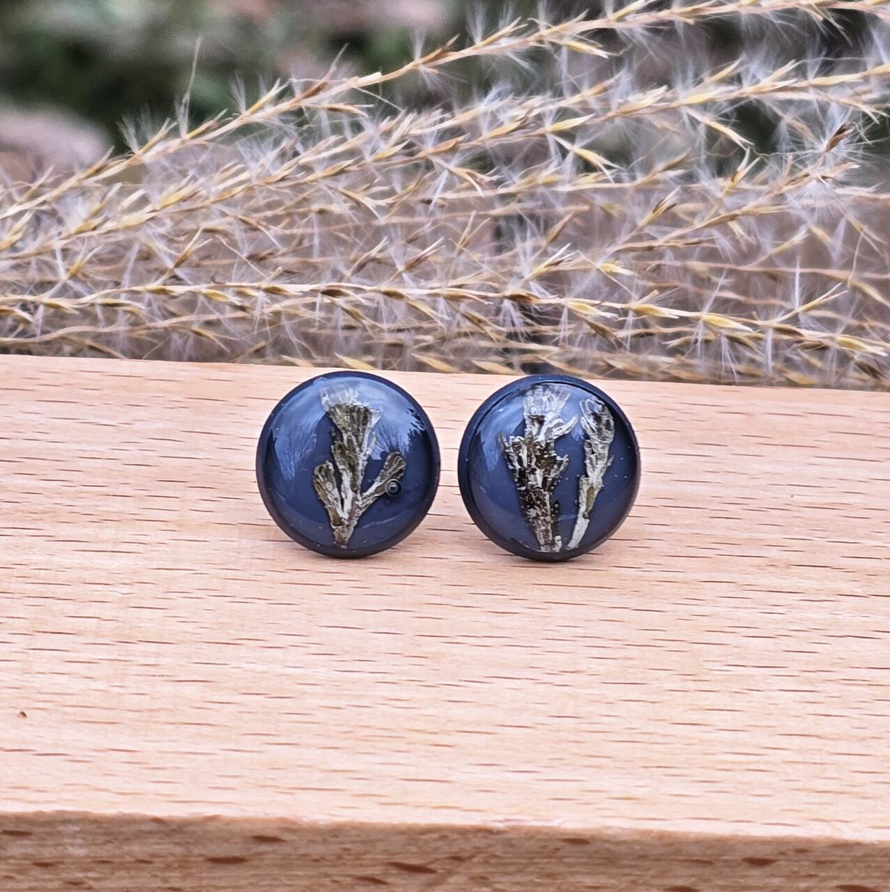 Sztyfty wykonane ze stali malowanej na kolor grafitowy . W środku listki, utrwalone na zawsze w żywicy epoksydowej . Urocza biżuteria z prawdziwymi roślinami.