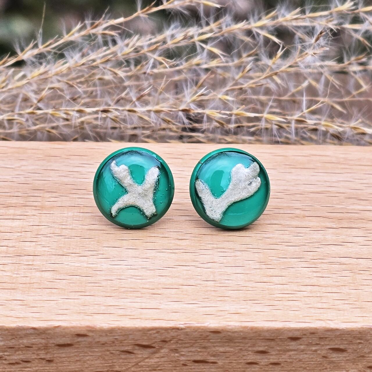 Sztyfty wykonane ze stali malowanej na kolor zielony . W środku listki starca, utrwalone na zawsze w żywicy epoksydowej . Urocza biżuteria z prawdziwymi roślinami.