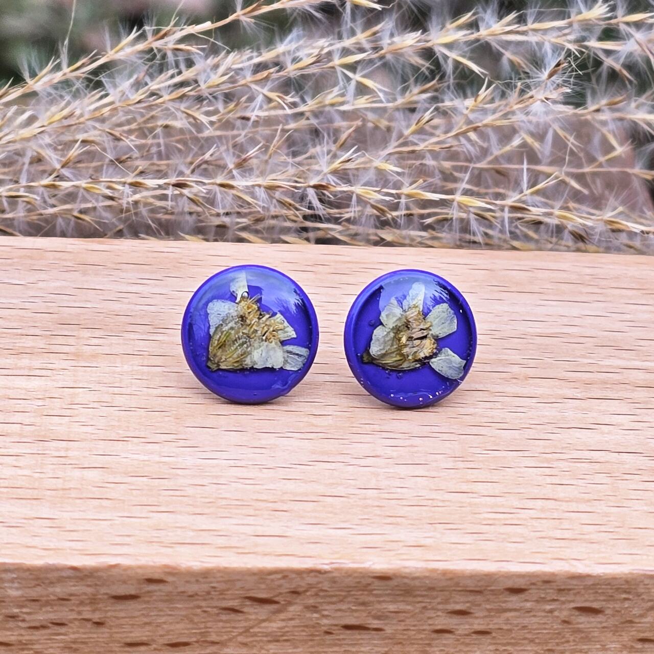 Sztyfty wykonane ze stali malowanej na kolor fioletowy . W środku kwiaty żółtego krwawnika, utrwalone na zawsze w żywicy epoksydowej . Urocza biżuteria z prawdziwymi roślinami.