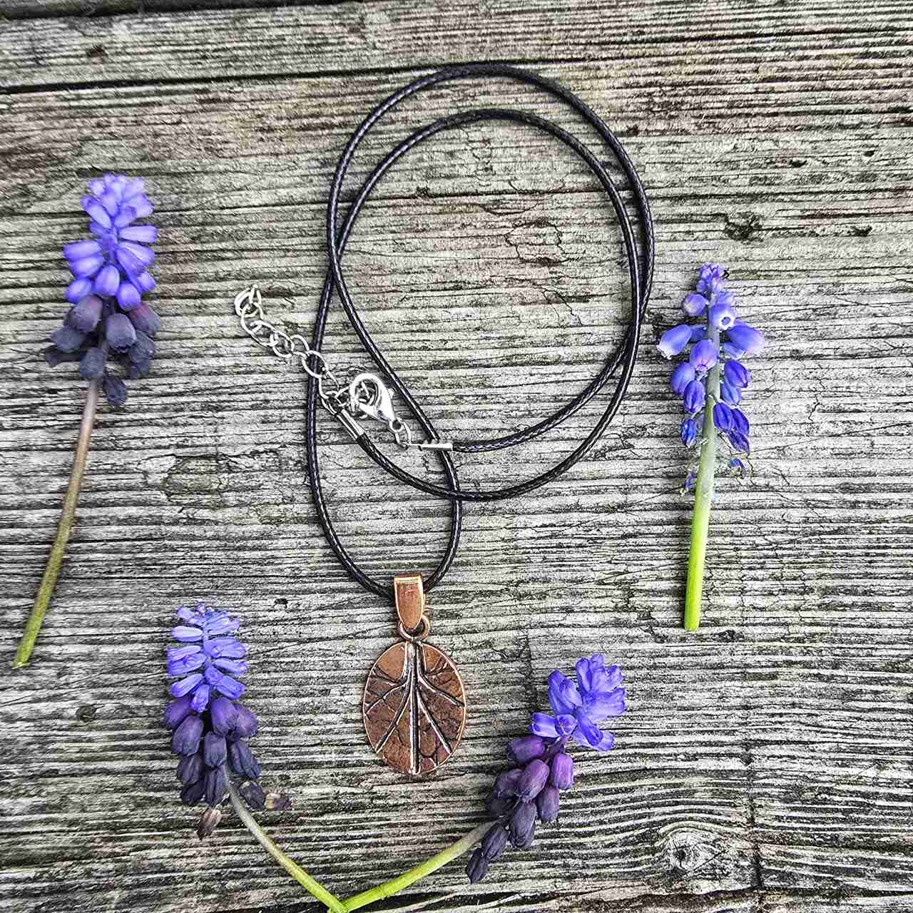 Naszyjnik wykonany z miedzi z odciśniętymi prawdziwymi roślinami. Miedź ma piękny, głęboki kolor i ma korzystny wpływ na organizm. W komplecie z zapinanym sznurkiem woskowanym.