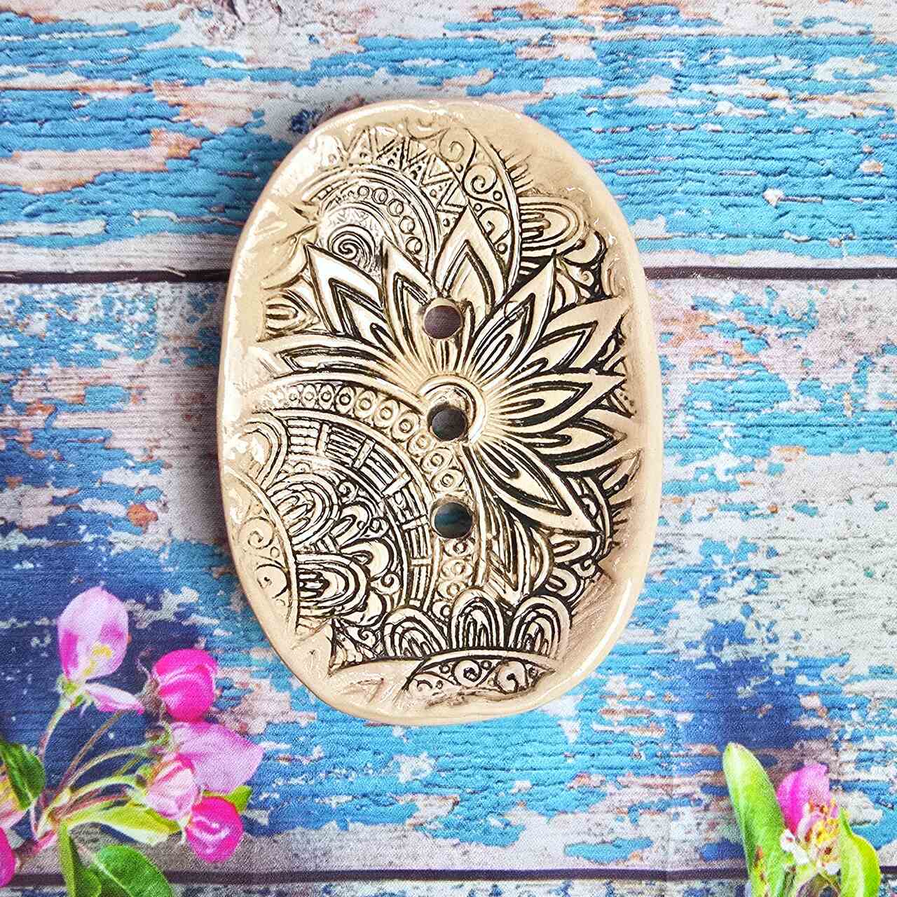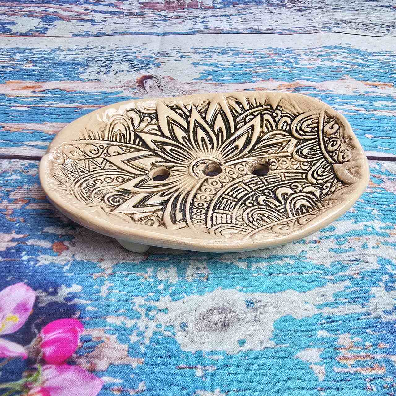 Ceramiczna mydelniczka wykonana ręcznie w pracowni Ceramika z Magicznego Domu. W środku odcisk mozaiki. Szkliwiona. Mydelniczka posiada nóżki, oraz otwory, które sprawiają, że używane mydło nie leży w wodzie. Przepiękny i niezbędny drobiazg do każdej łazienki.