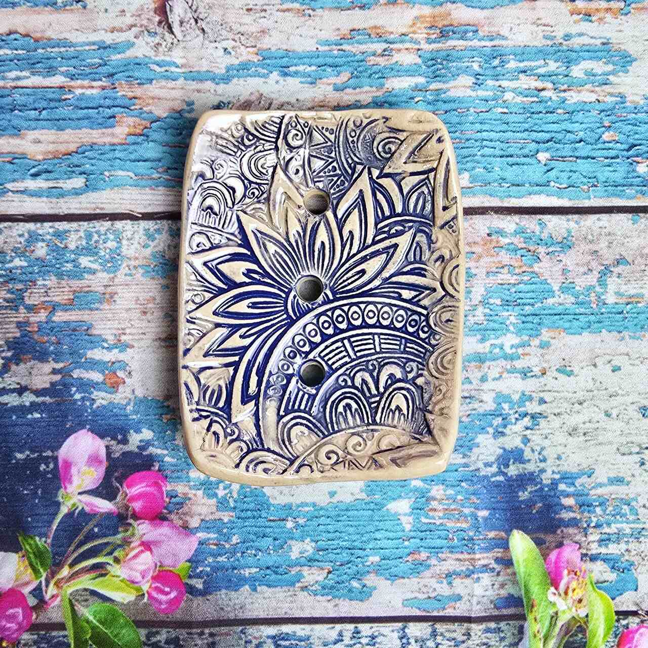 Ceramiczna mydelniczka wykonana ręcznie w pracowni Ceramika z Magicznego Domu. W środku odcisk mozaiki. Szkliwiona. Mydelniczka posiada nóżki, oraz otwory, które sprawiają, że używane mydło nie leży w wodzie. Przepiękny i niezbędny drobiazg do każdej łazienki.