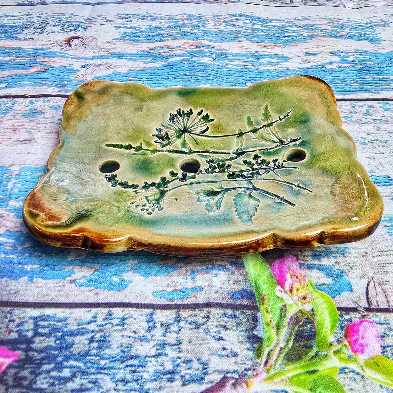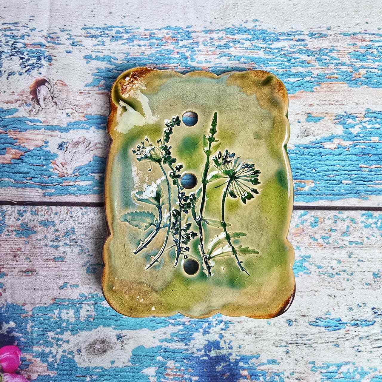 Ceramiczna mydelniczka wykonana ręcznie w pracowni Ceramika z Magicznego Domu. W środku odcisk prawdziwych roślin. Szkliwiona. Mydelniczka posiada nóżki, oraz otwory, które sprawiają, że używane mydło nie leży w wodzie. Przepiękny i niezbędny drobiazg do każdej łazienki.