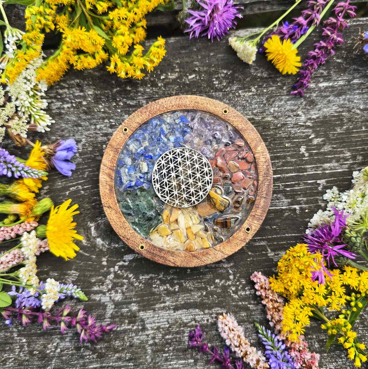 Podstawka na kadzidełka i stożki z kamieniami odpowiadającymi czakrom.