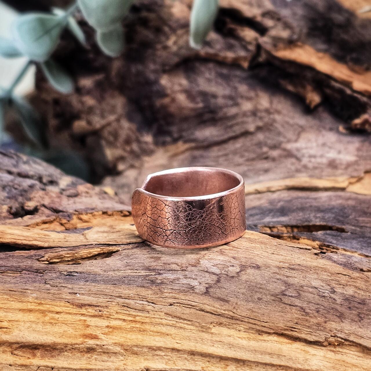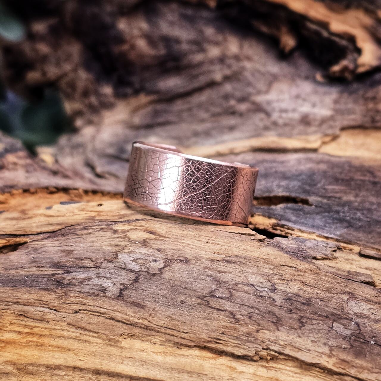 Pierścionek wykonany ręcznie z miedzi z odciskiem prawdziwych liści.  Biżuteria miedziana noszona w bezpośrednim kontakcie ze skórą ma szereg właściwości zdrowotnych. Pomaga w likwidowaniu stanów zapalnych stawów, pomaga w leczeniu bólów stawów. Przynosi ulgę w dolegliwościach reumatycznych. Dodatkowo działa na przyśpieszenie metabolizmu glukozy i cholesterolu. Pomaga w regeneracji organizmu i zasypianiu. Miedź wchłania się przez skórę dlatego nie powinny jej nosić kobiet w ciąży oraz osoby z chorobami serca.