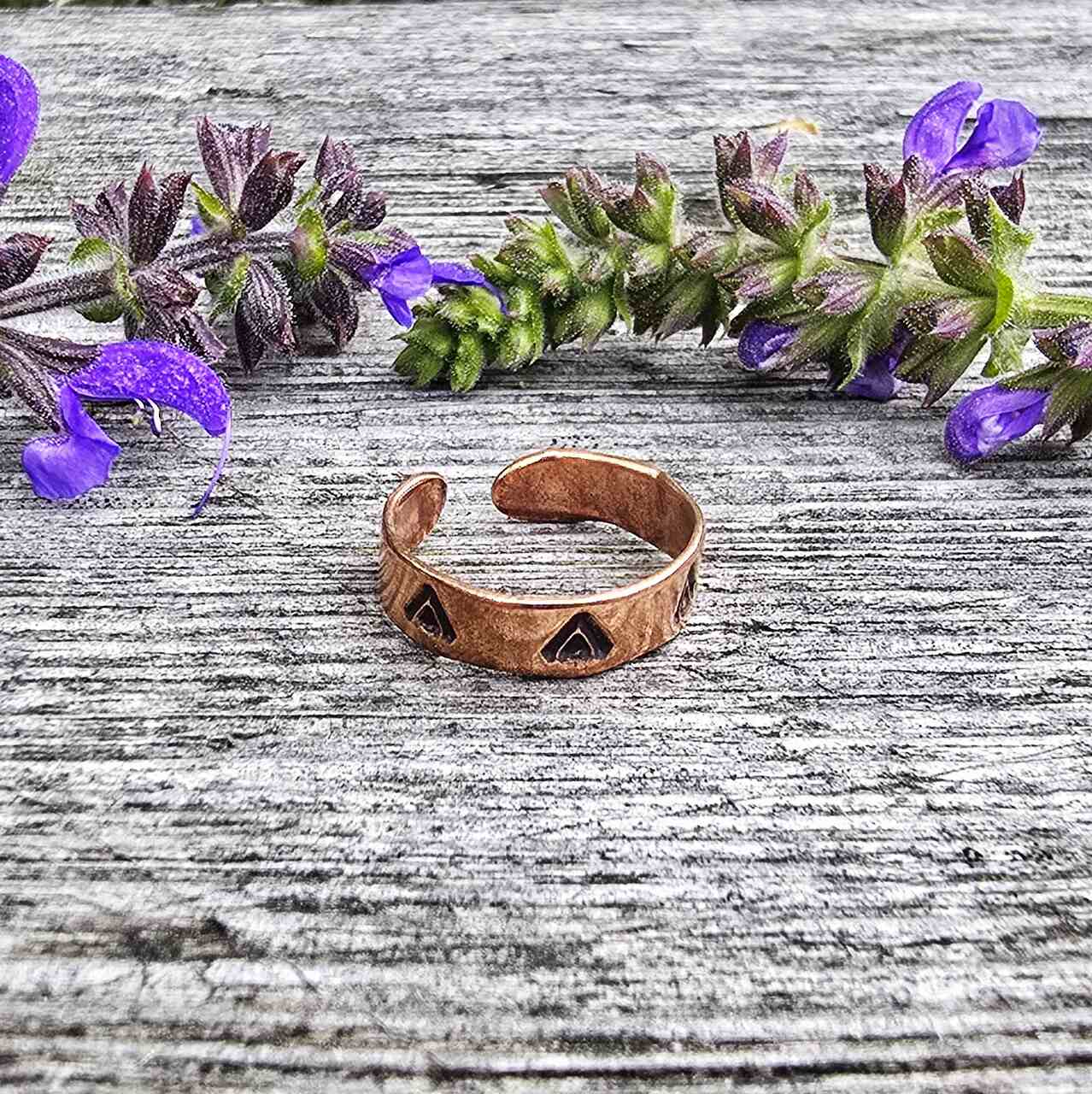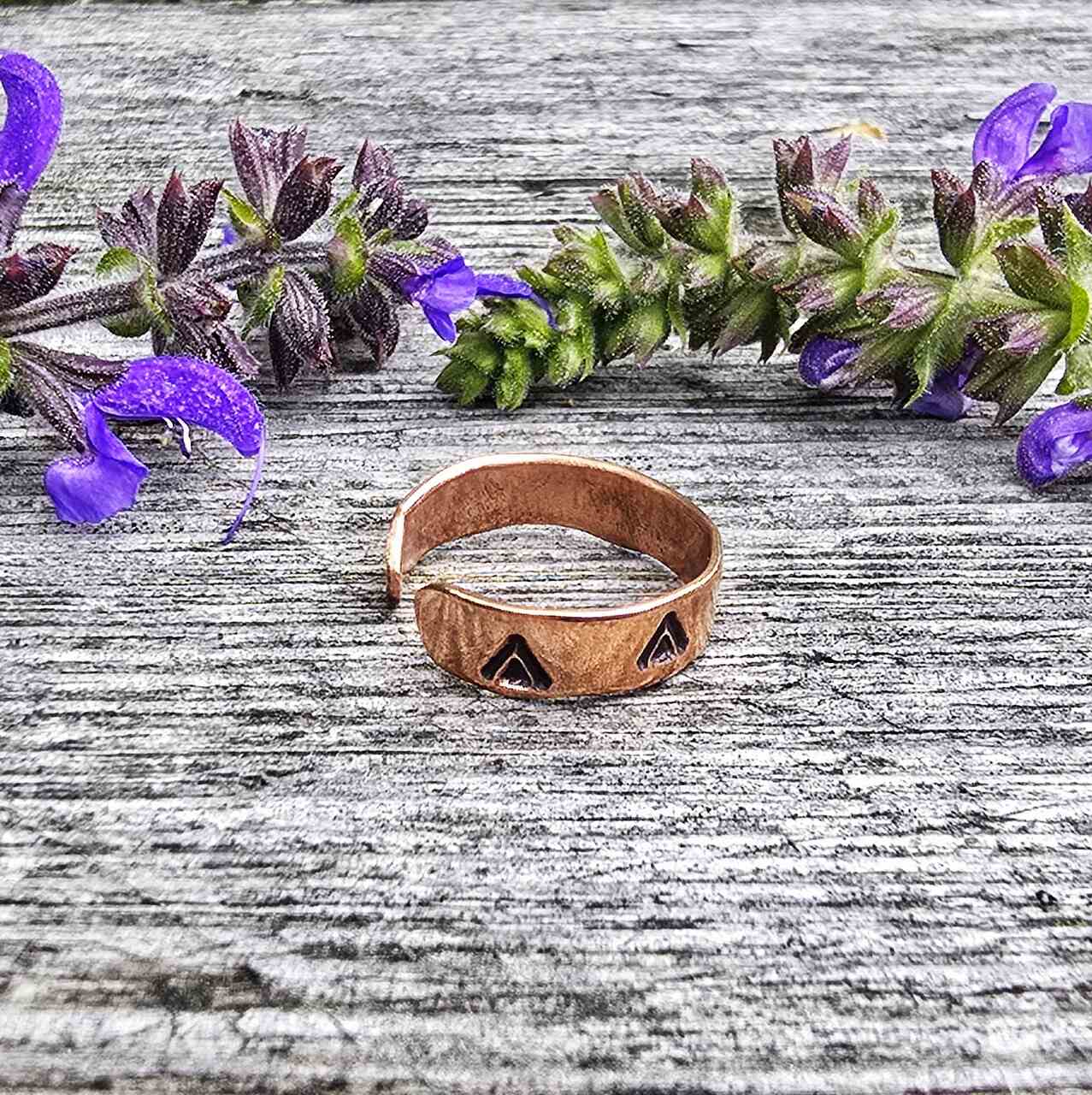 Pierścionek wykonany ręcznie z miedzi.  Biżuteria miedziana noszona w bezpośrednim kontakcie ze skórą ma szereg właściwości zdrowotnych. Pomaga w likwidowaniu stanów zapalnych stawów, pomaga w leczeniu bólów stawów. Przynosi ulgę w dolegliwościach reumatycznych. Dodatkowo działa na przyśpieszenie metabolizmu glukozy i cholesterolu. Pomaga w regeneracji organizmu i zasypianiu. Miedź wchłania się przez skórę dlatego nie powinny jej nosić kobiet w ciąży oraz osoby z chorobami serca.