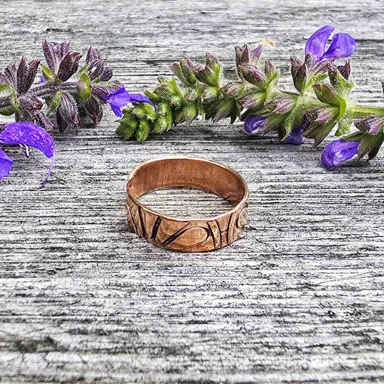 Pierścionek wykonany ręcznie z miedzi.  Biżuteria miedziana noszona w bezpośrednim kontakcie ze skórą ma szereg właściwości zdrowotnych. Pomaga w likwidowaniu stanów zapalnych stawów, pomaga w leczeniu bólów stawów. Przynosi ulgę w dolegliwościach reumatycznych. Dodatkowo działa na przyśpieszenie metabolizmu glukozy i cholesterolu. Pomaga w regeneracji organizmu i zasypianiu. Miedź wchłania się przez skórę dlatego nie powinny jej nosić kobiet w ciąży oraz osoby z chorobami serca.