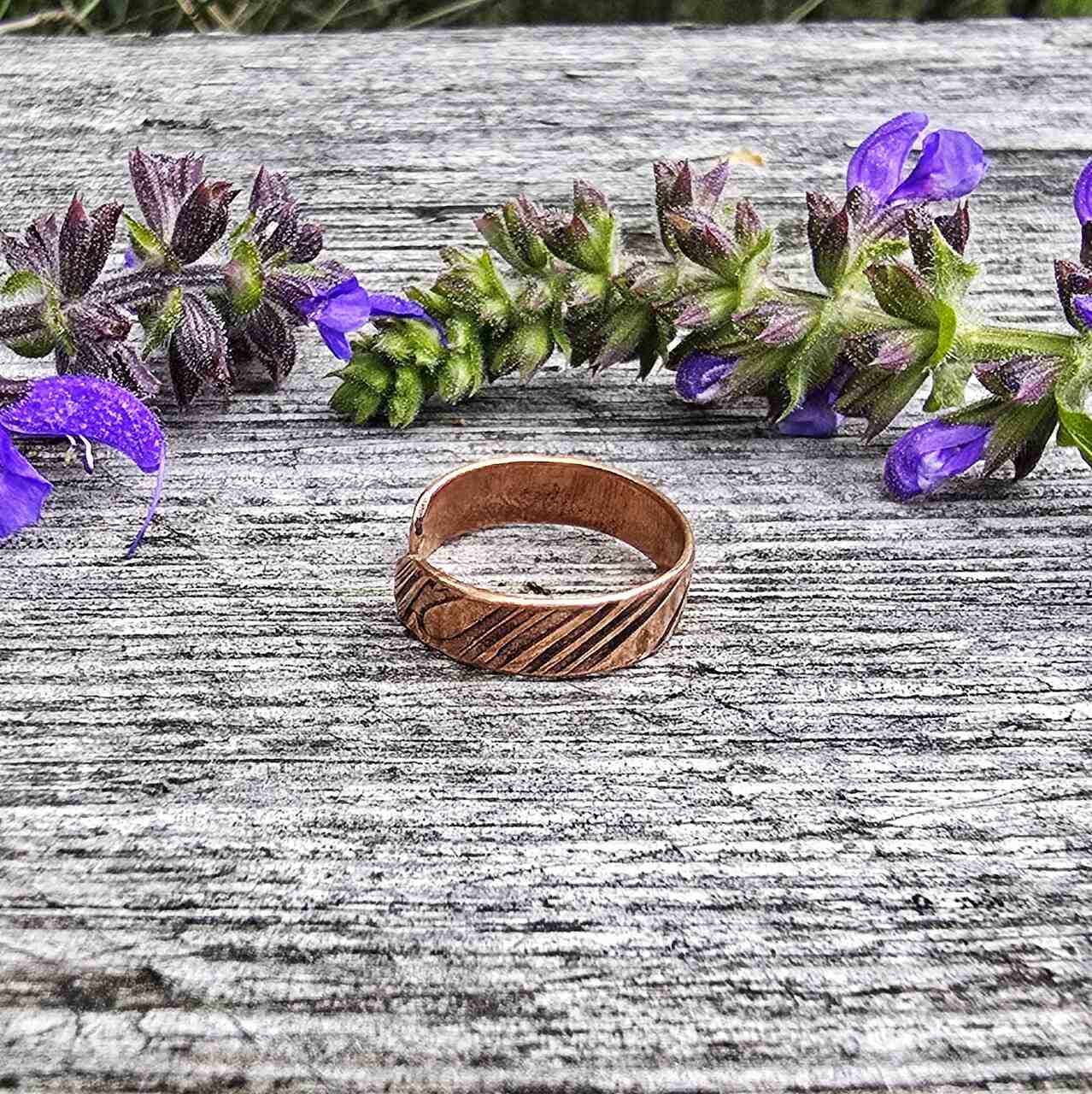 Pierścionek wykonany ręcznie z miedzi.  Biżuteria miedziana noszona w bezpośrednim kontakcie ze skórą ma szereg właściwości zdrowotnych. Pomaga w likwidowaniu stanów zapalnych stawów, pomaga w leczeniu bólów stawów. Przynosi ulgę w dolegliwościach reumatycznych. Dodatkowo działa na przyśpieszenie metabolizmu glukozy i cholesterolu. Pomaga w regeneracji organizmu i zasypianiu. Miedź wchłania się przez skórę dlatego nie powinny jej nosić kobiet w ciąży oraz osoby z chorobami serca.