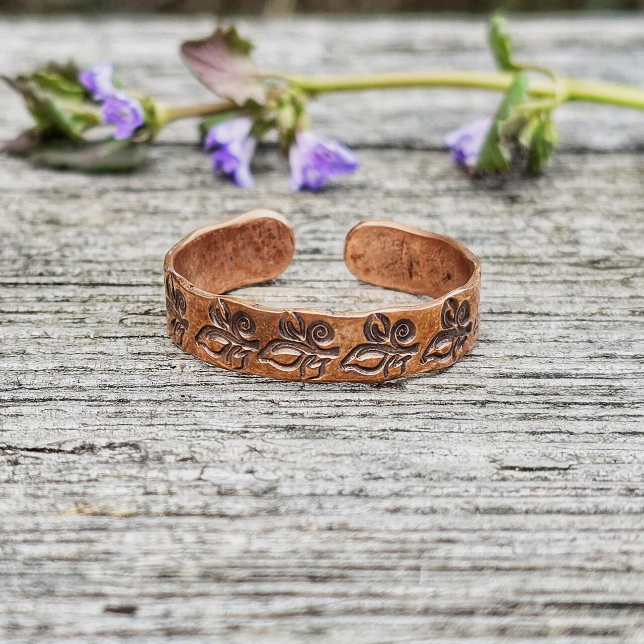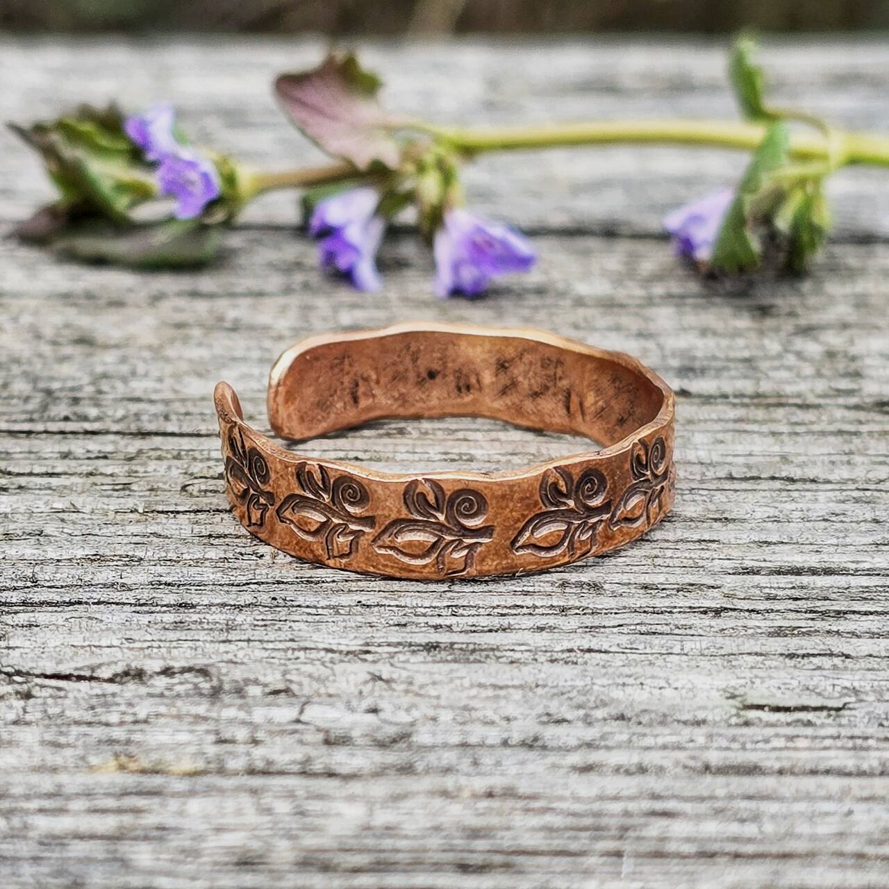 Pierścionek wykonany ręcznie z miedzi.  Biżuteria miedziana noszona w bezpośrednim kontakcie ze skórą ma szereg właściwości zdrowotnych. Pomaga w likwidowaniu stanów zapalnych stawów, pomaga w leczeniu bólów stawów. Przynosi ulgę w dolegliwościach reumatycznych. Dodatkowo działa na przyśpieszenie metabolizmu glukozy i cholesterolu. Pomaga w regeneracji organizmu i zasypianiu. Miedź wchłania się przez skórę dlatego nie powinny jej nosić kobiet w ciąży oraz osoby z chorobami serca.