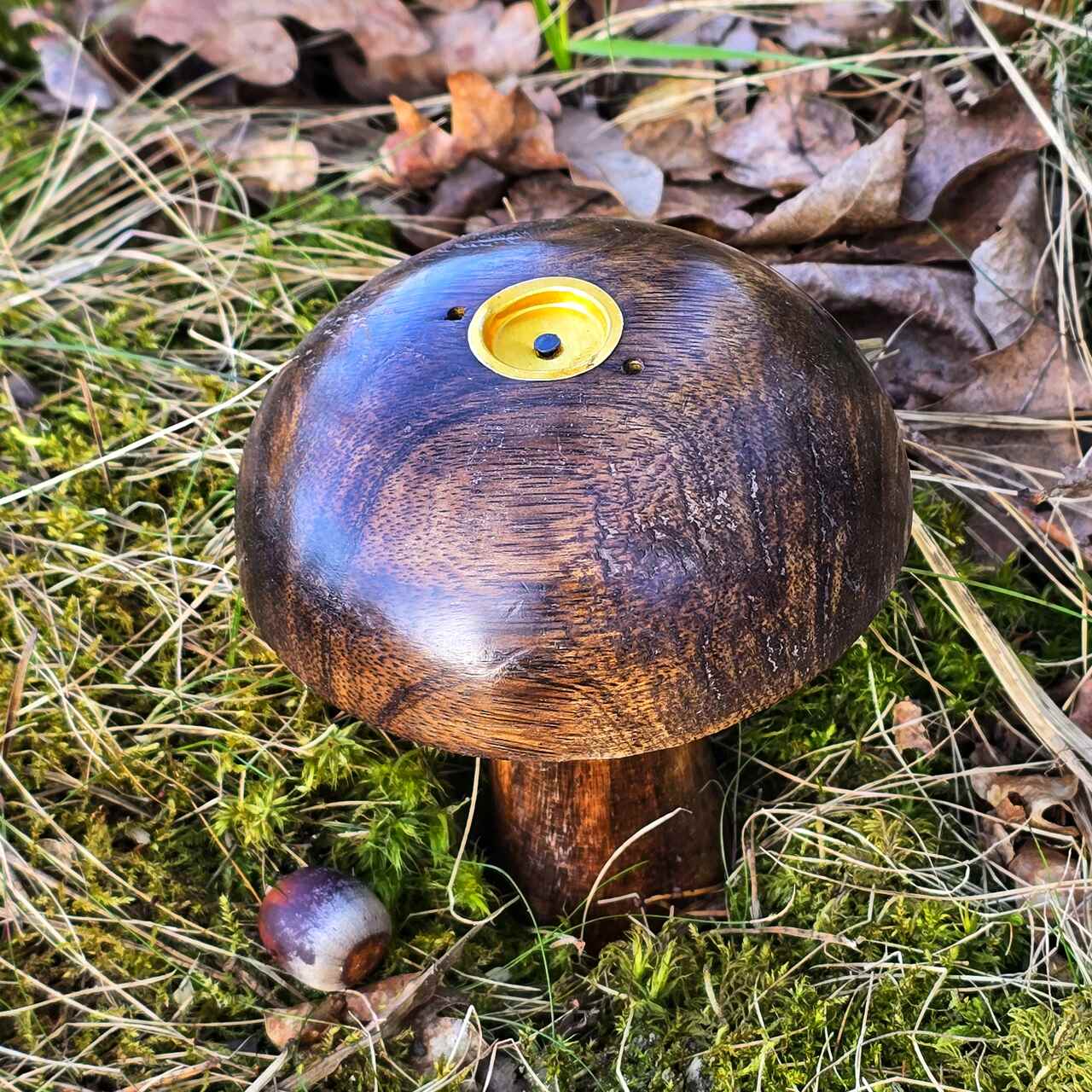 Podstawka pod kadzidła w kształcie grzybka. Wykonana z drewna mango. Posiada metalowa wkładkę pod kadzidełka stożkowe, oraz dwa otwory na kadzidełka patyczkowe. Wysokość 10 cm.