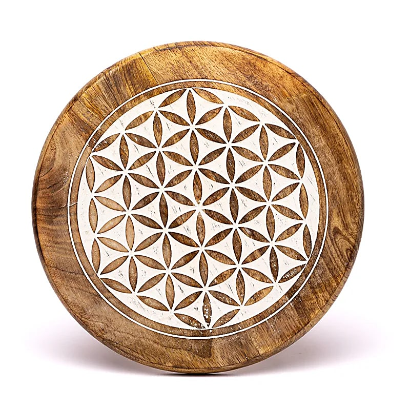 Kompaktowy stolik boczny wykonany z litego drewna mango, z eleganckim, białym nadrukiem Kwiatu Życia na blacie. Idealny jako element dekoracyjny, podwyższenie na przedmioty duchowe lub jako blat do przechowywania kryształów i kamieni szlachetnych.