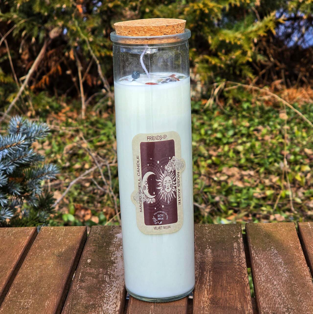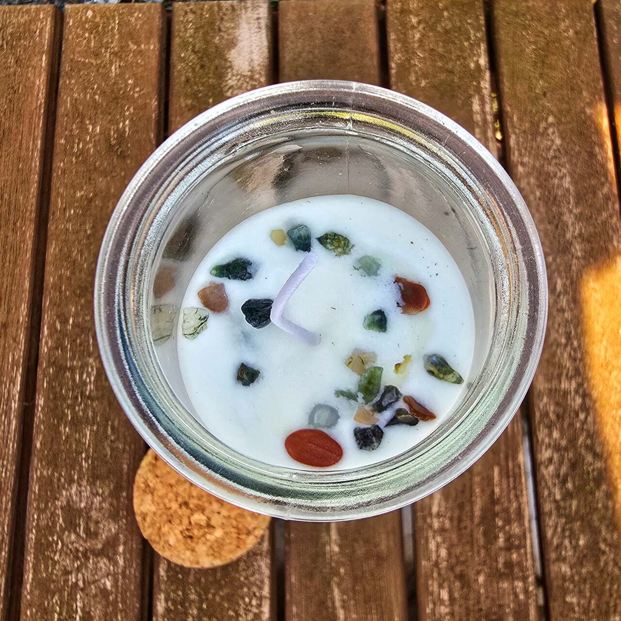 Świeca sojowa o zapachu aksamitny księżyc z kamieniami agat mszysty.