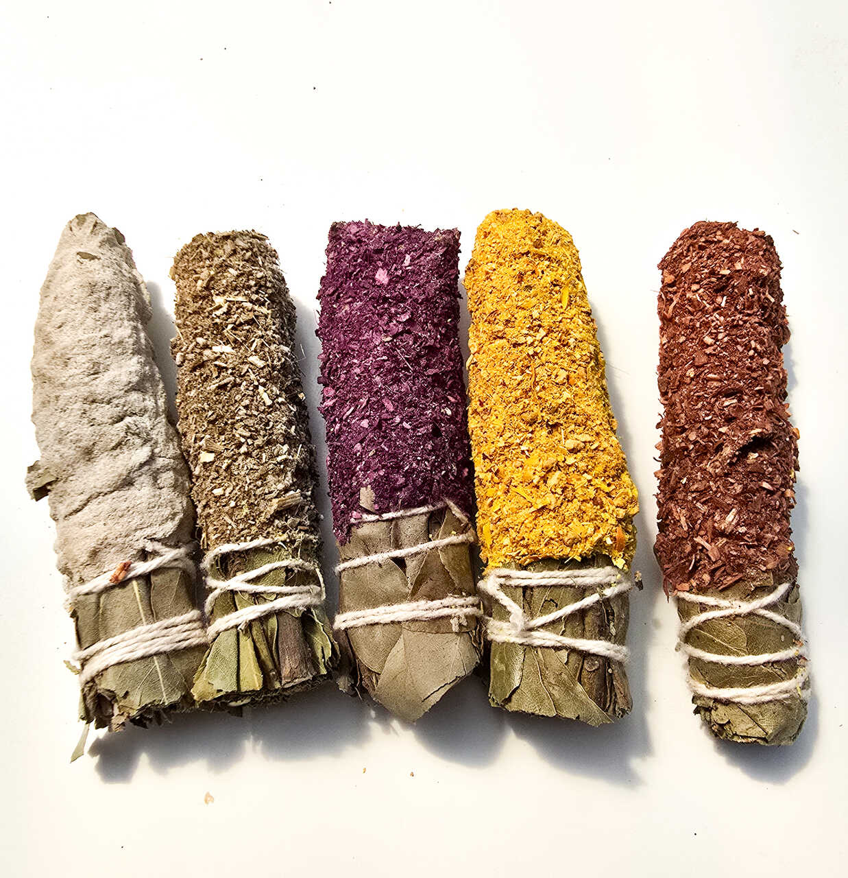 Kadzidła ziołowe w wiązkach firmy Sagrada Madre. W pięknym pudełeczku znajdziesz 5 sztuk kadzideł. Każde zawiera inną kompozycję. W środku znajdują się laur, wawrzyn i cedr. Otoczone mieszanką żywic i kwiatów: nagietek i rumianek, róża, pomarańcza i cytronella, biała yagra, biała szałwia. Kadzidła zawierają wyłącznie naturalne rośliny i żywice. Jedno kadzidło ma długość około 12 cm i pali się około 2 godziny. Możesz je również użyć kilka razy, gasząc je w soli lub piasku. Idealne na prezent.